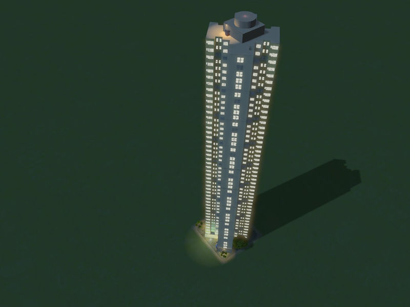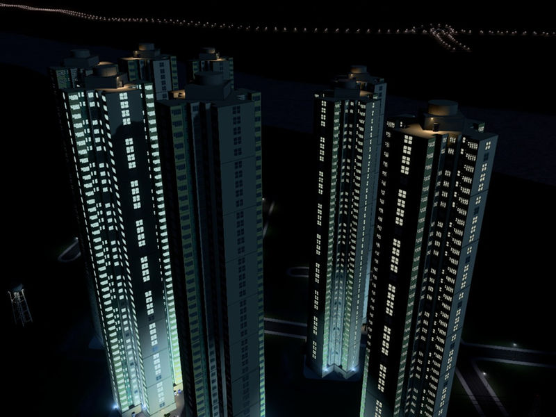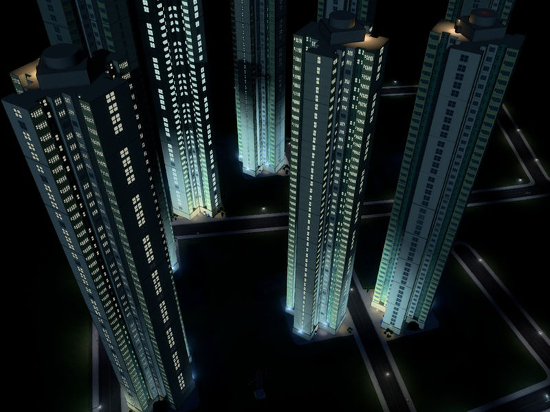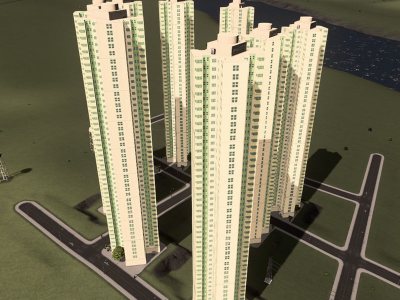 In order to fit into the 32×32 metre plot of 4×4 tiles, the tower’s wings are somewhat truncated (real proportions are 35×42 or 50×50 metres). The height is 45 storeys (157 metres; at real scale (1:1). 4×4, Level 5 (for the highest population level). It’s based on the Harmony standard type public housing block.