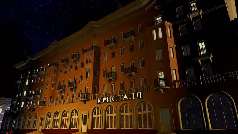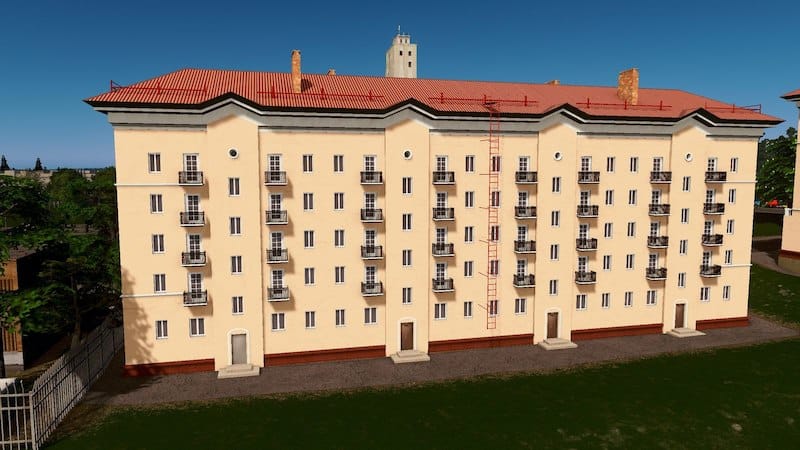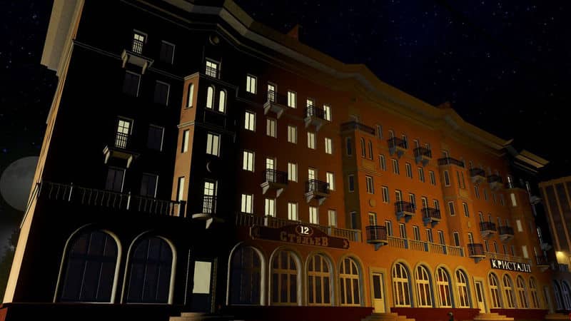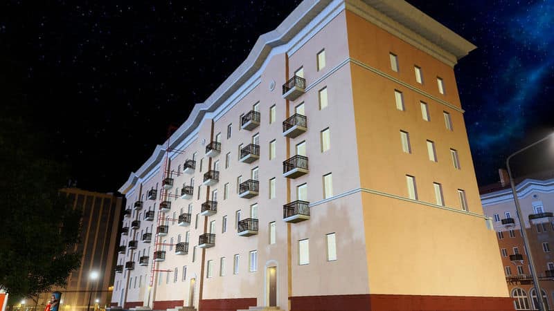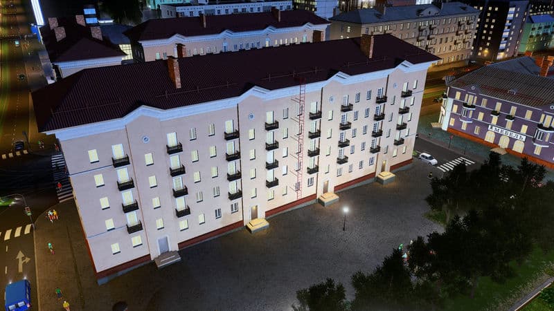 Five-survey four-porch residental house for 48 apartments (in the game for 16 families) with shops on first floor.