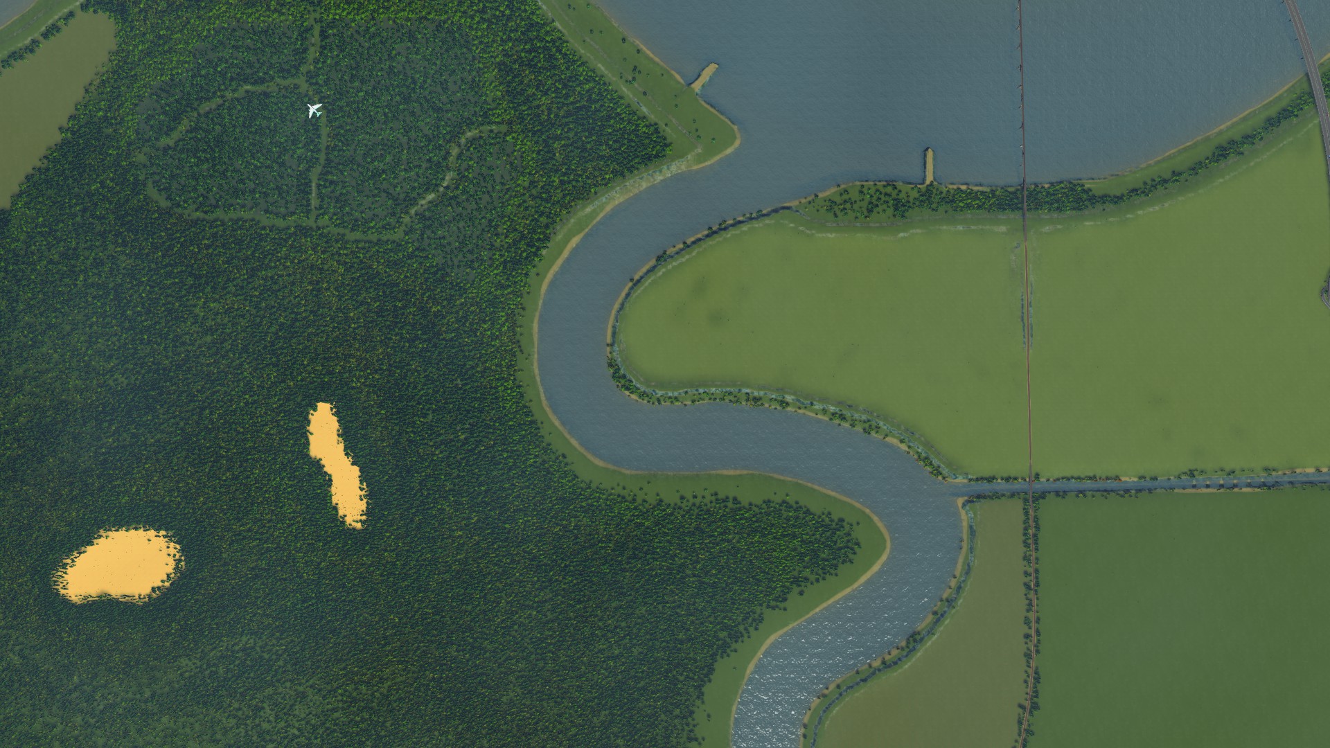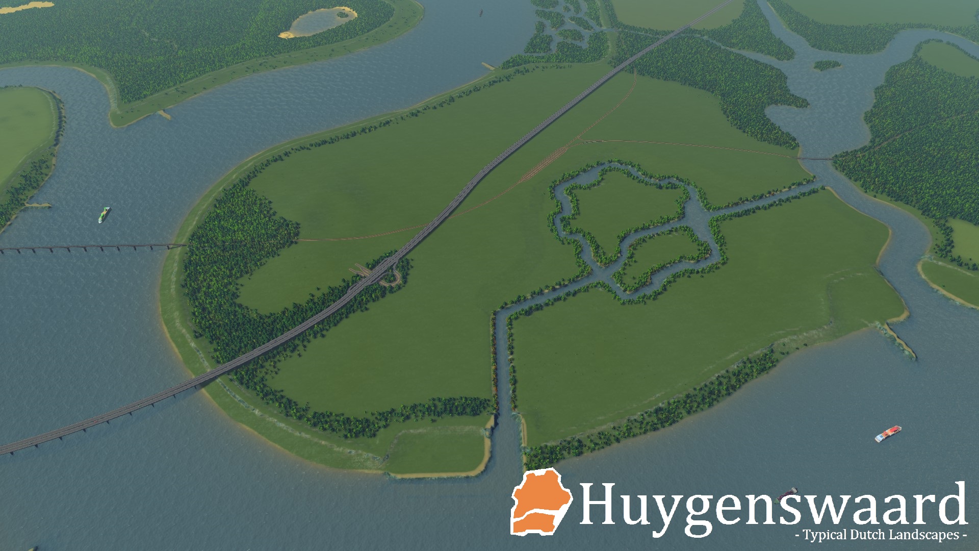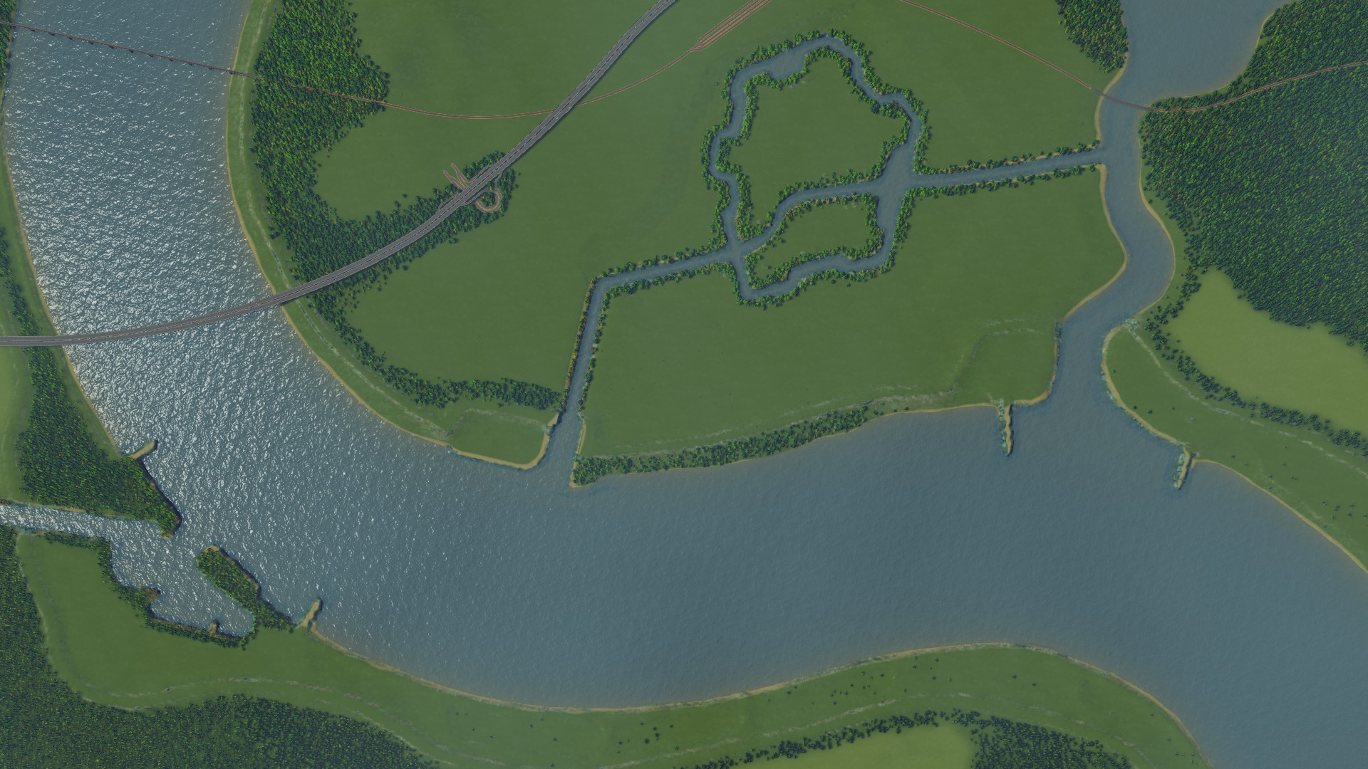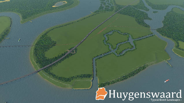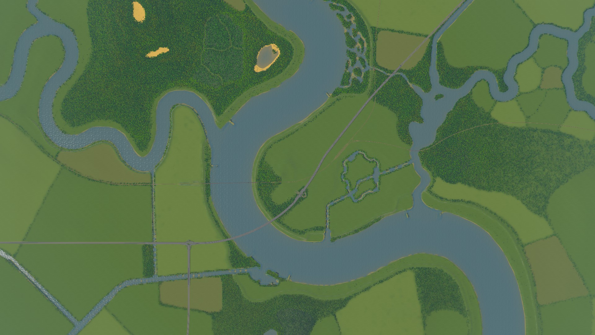 As with my other typically Dutch map, Drebbeldam, water plays an important role. This map has a large river crossing nearly the entire playing area. There are many siderivers, creeks and canals. I have made two small lakes, one with a sandy shore. There is an area that I think is excellent to create a holiday park, something I really enjoy making in the game. Along the river there are low dikes and stretches of floodland. It is perfectly fine to build there as water flow is completely stable. I’ve also included breakwaters, called ‘strekdammen’ in Dutch, which are an actual method of protecting river banks. Therefore, the current near the various inlets should be considerably slower. I created a medieval city centre with canals around the original defence structures. Many old Dutch cities have these types of star shaped centres, though some have filled the moat to create roads. The land around the centre is slightly lower than it’s surroundings.