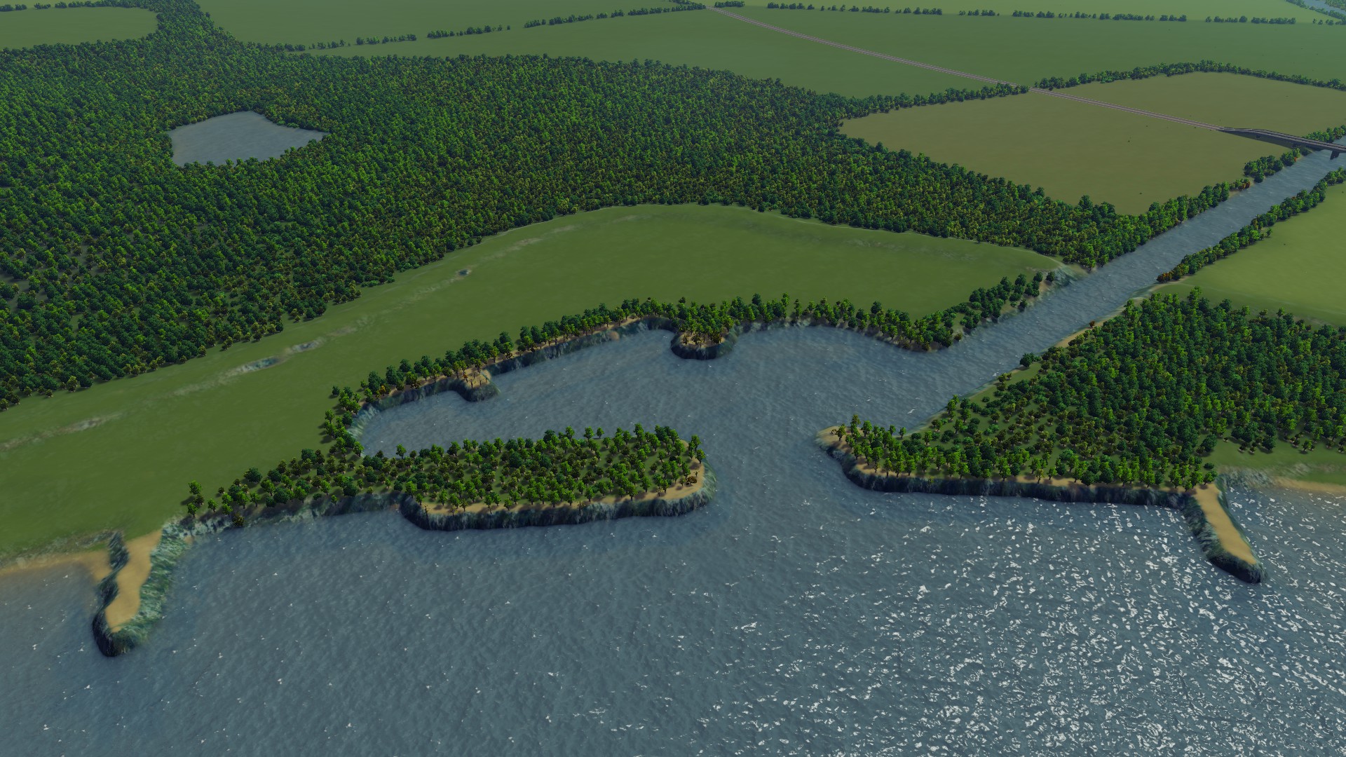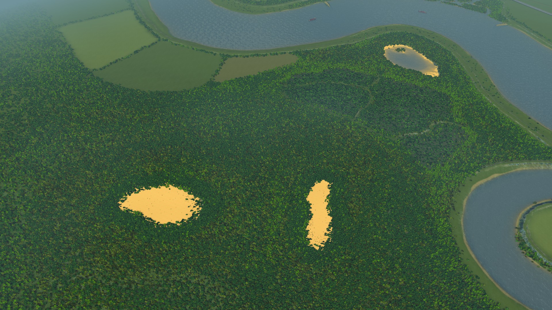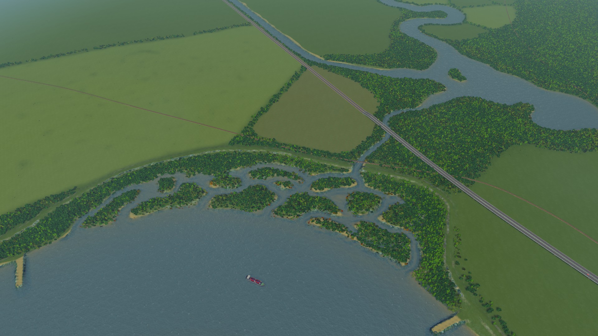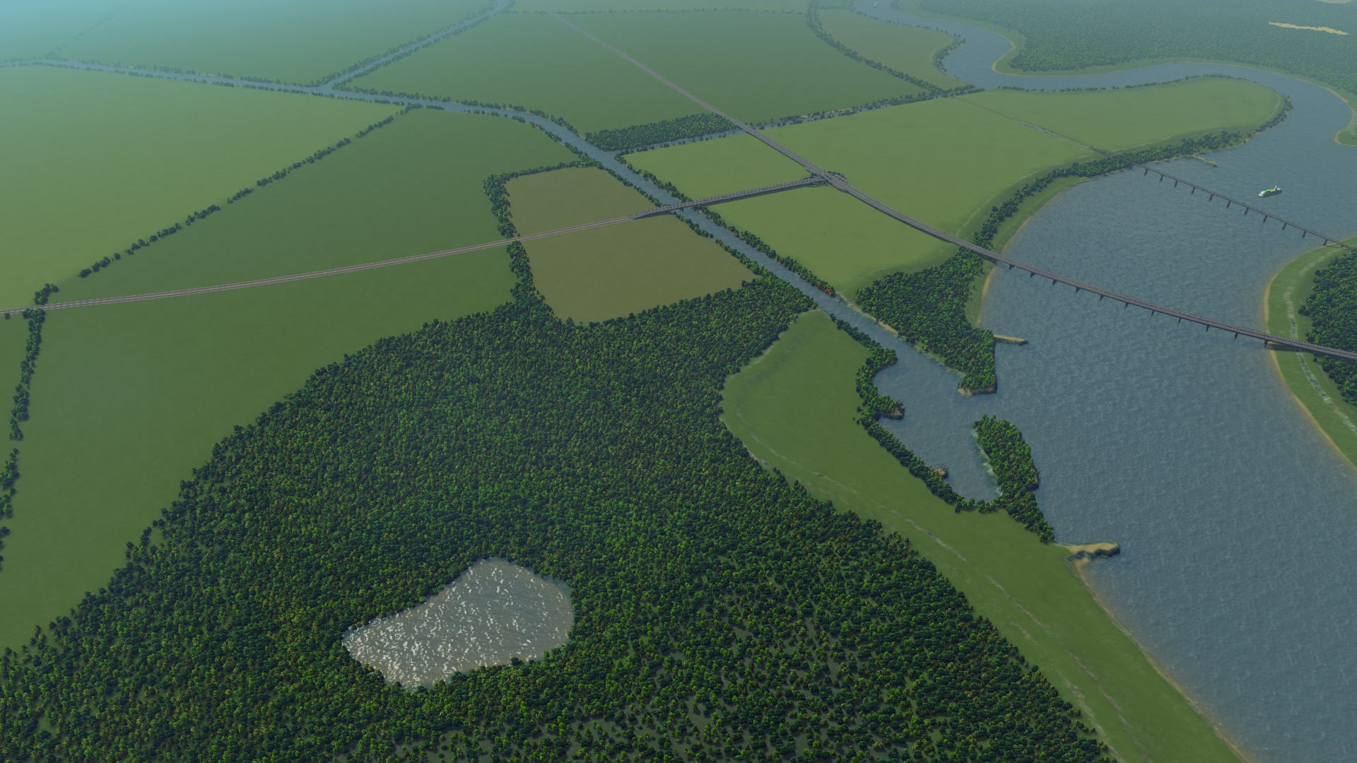 The region has three incoming rail lines, three highway routes and ship routes along the entire river. There are three areas for ore, all within the forests, and three for oil. There is plenty of farmland at the outskirts of the map.