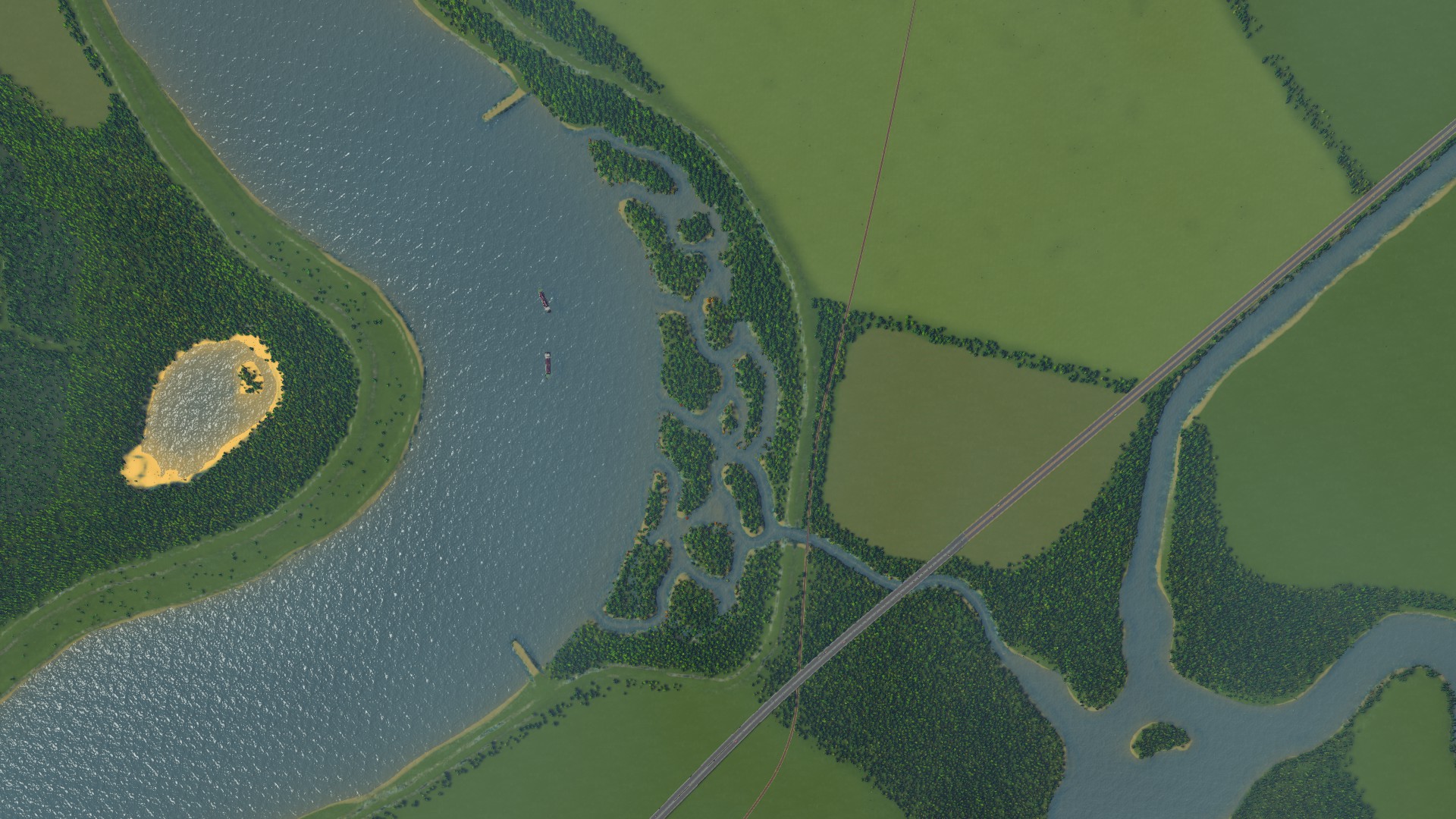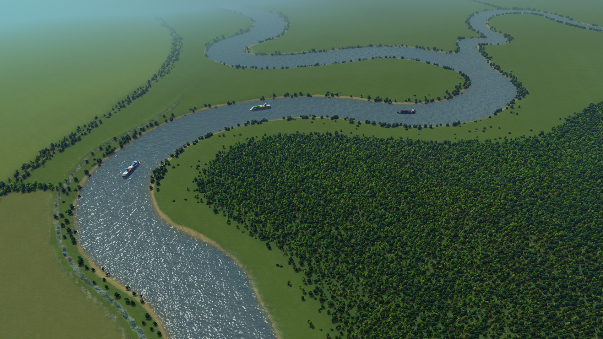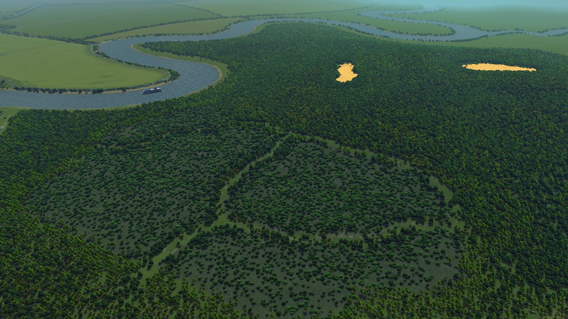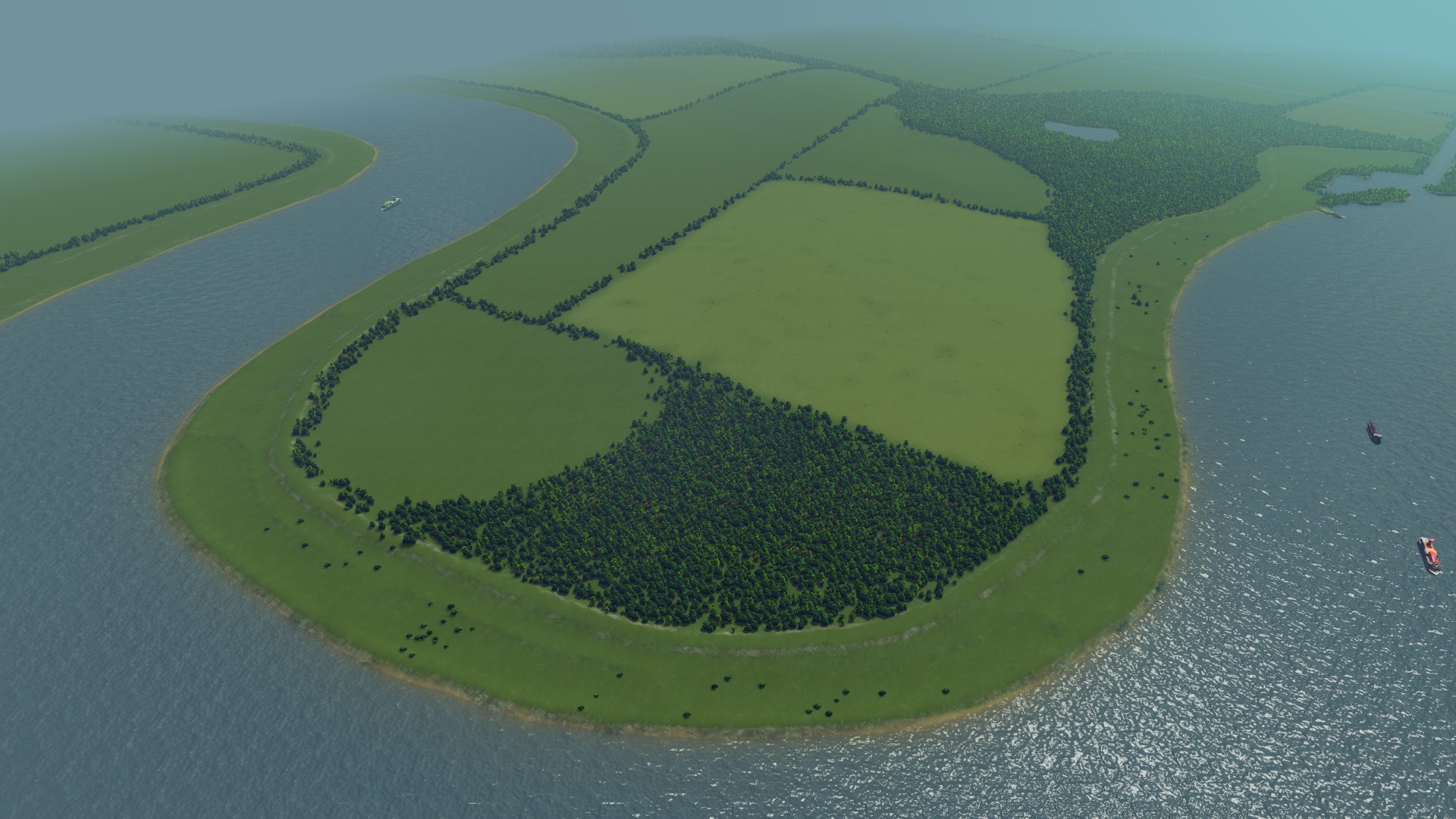 The region has three incoming rail lines, three highway routes and ship routes along the entire river. There are three areas for ore, all within the forests, and three for oil. There is plenty of farmland at the outskirts of the map.
