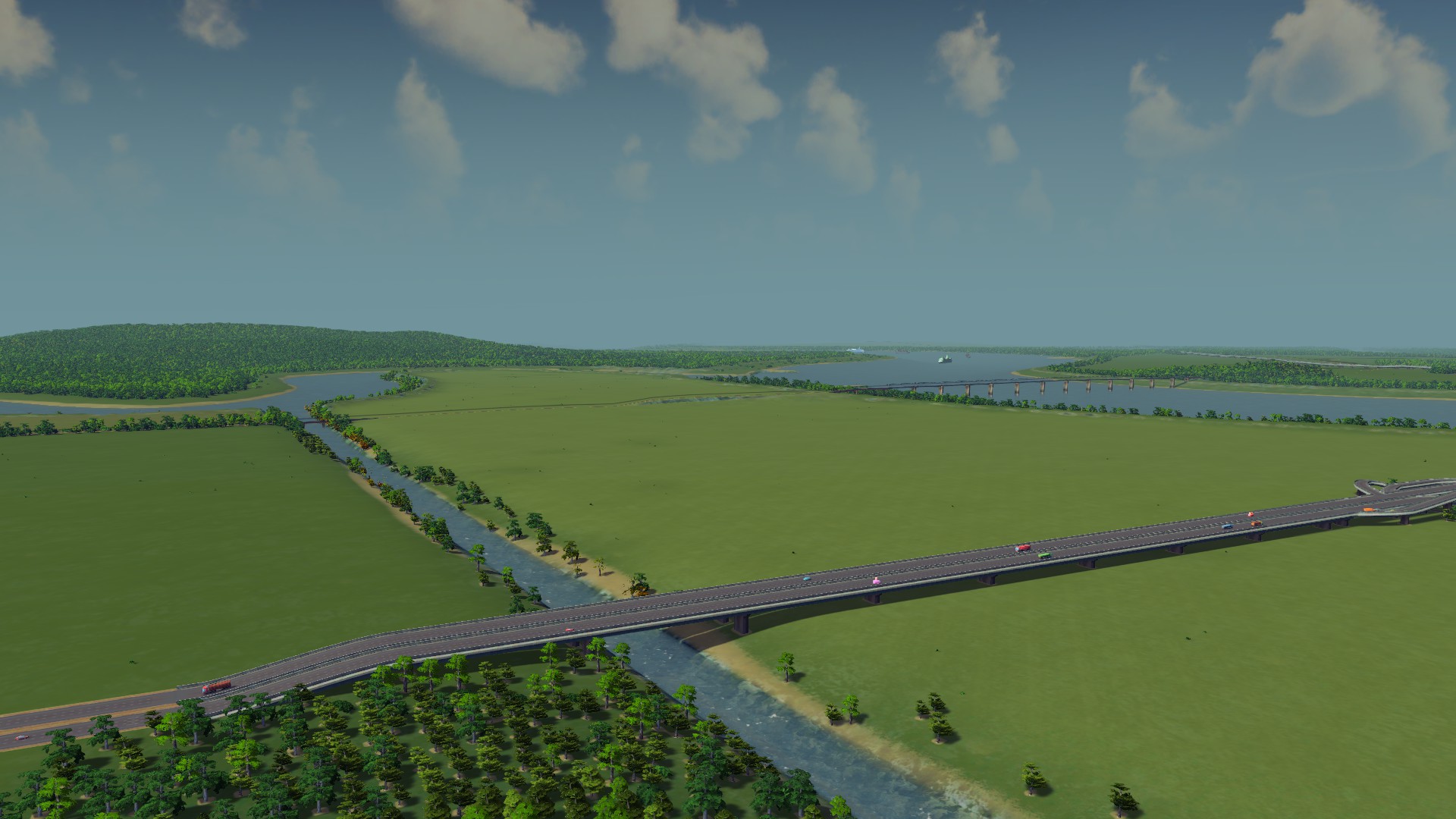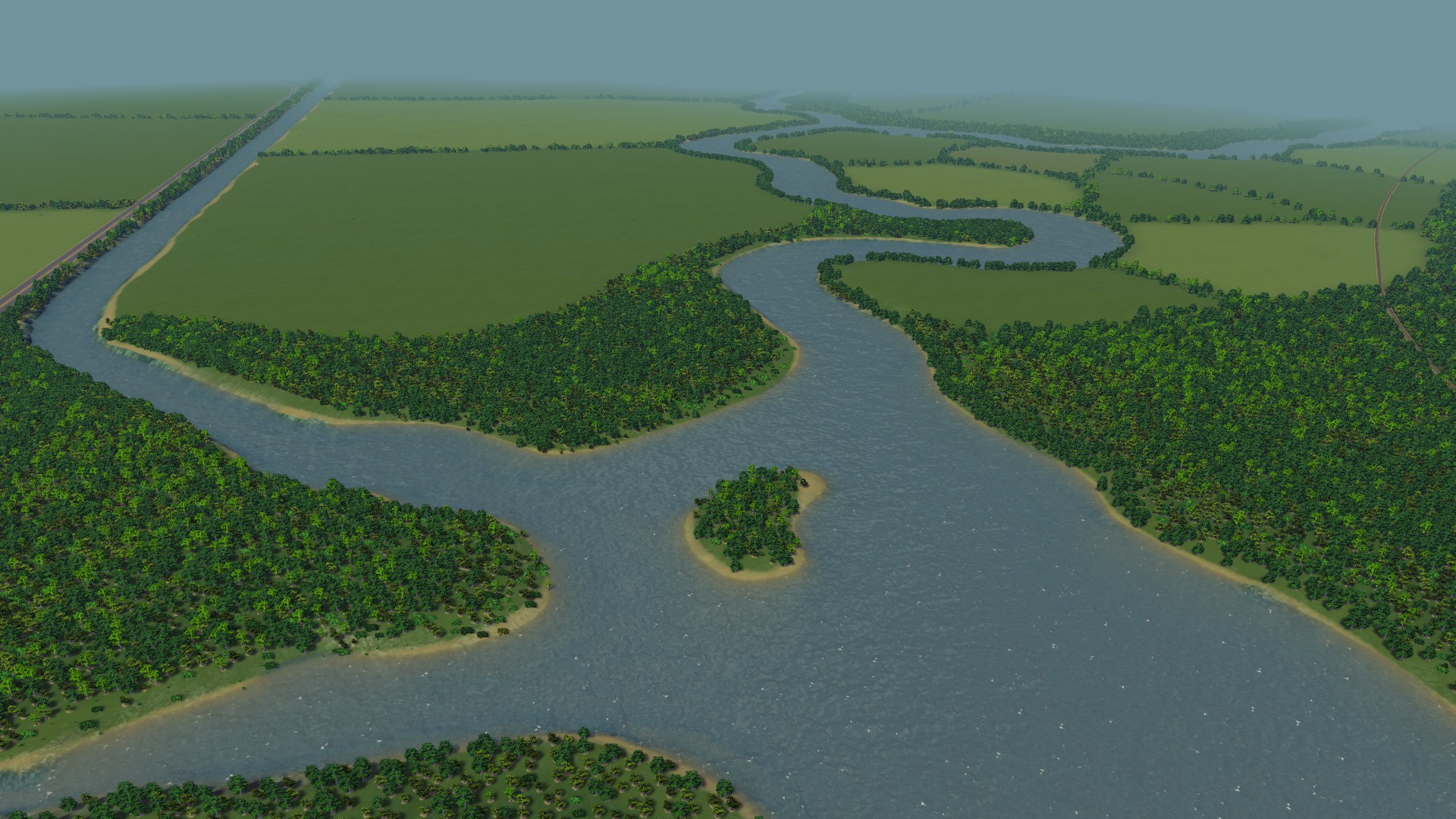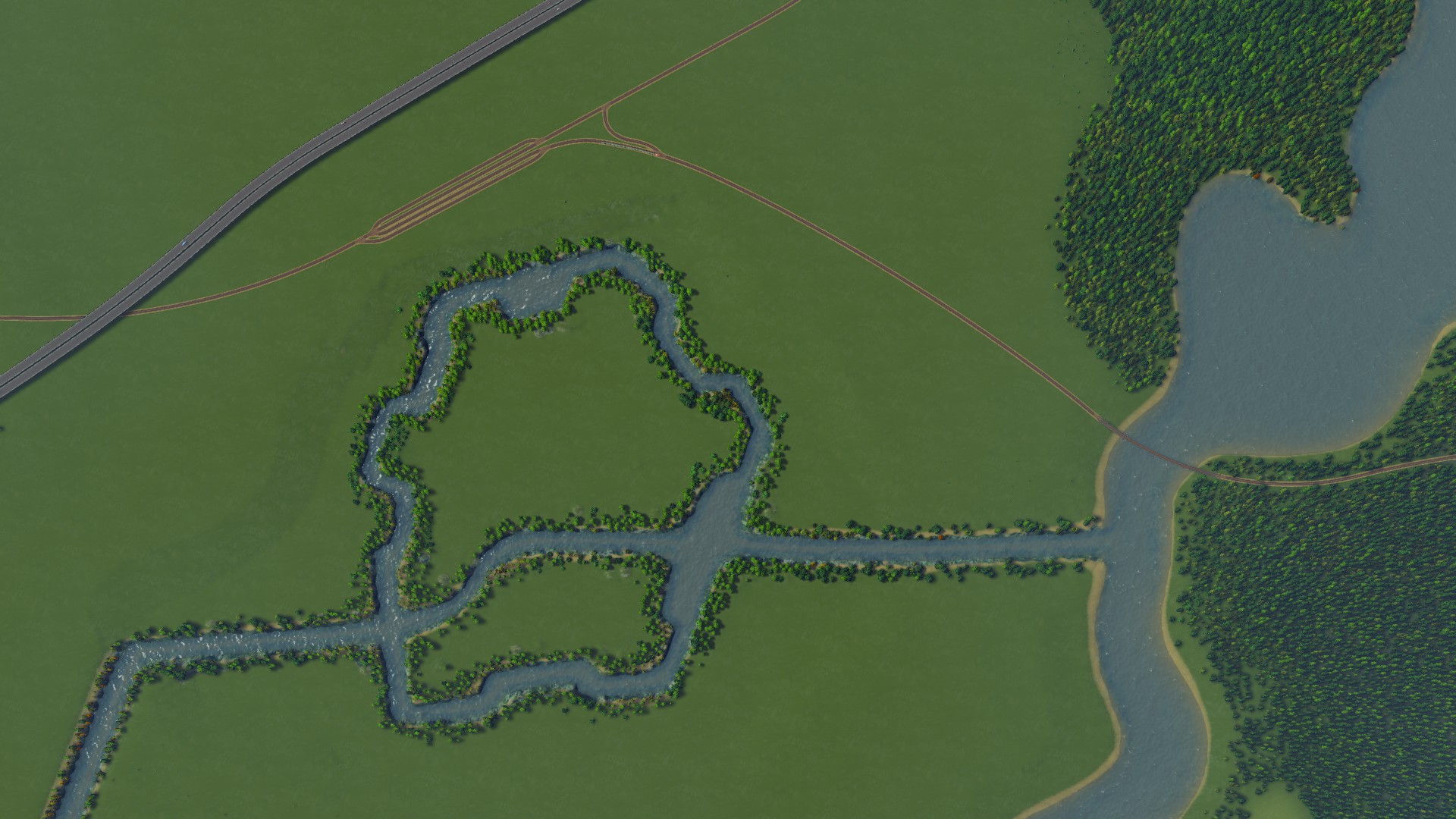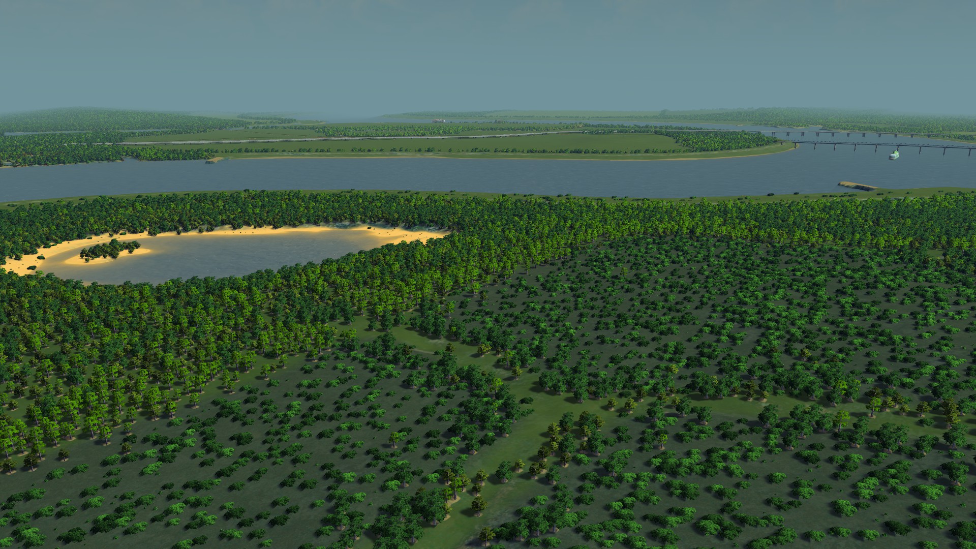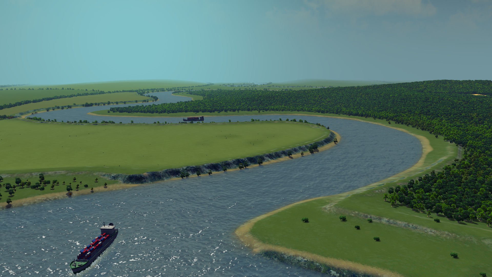 The region has three incoming rail lines, three highway routes and ship routes along the entire river. There are three areas for ore, all within the forests, and three for oil. There is plenty of farmland at the outskirts of the map.