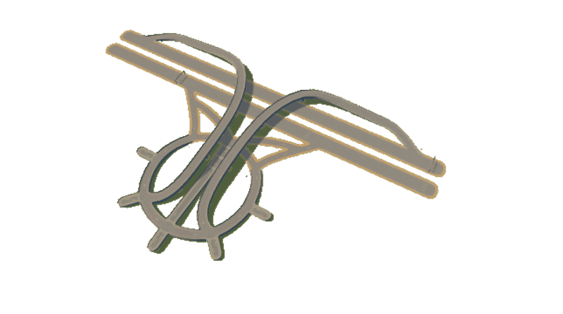 3-way highway exit with an integrated elevated roundabout for 5 ways in/out of city(residential districts). It’s meant for low and medium traffic density, however it is not intended for high traffic density. Roads width and type may be changed according to your needs.
