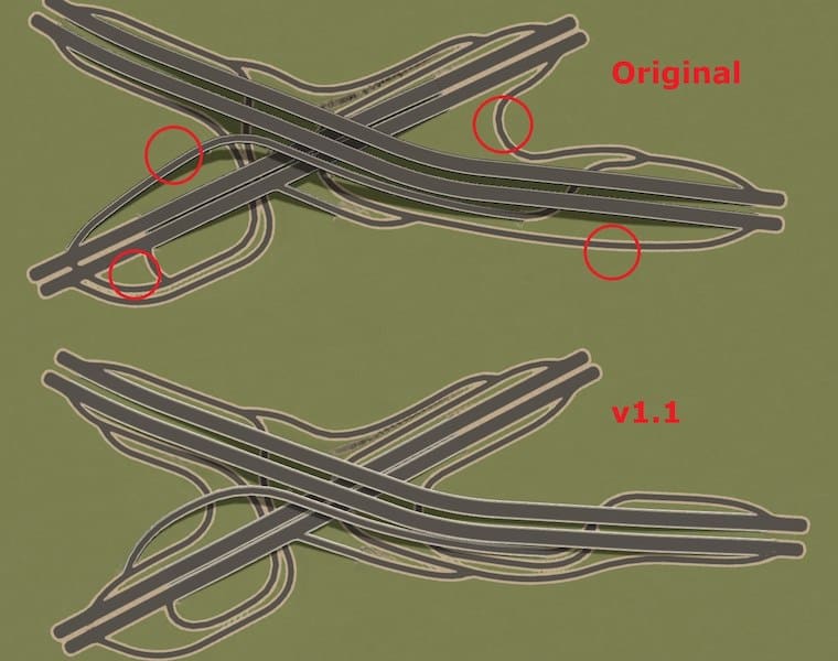 The 1.1 version I made to save more space and make it so the interchange has no at-grade crossing (see the picture). it’s size is also the same as the original, I only change the ramp. There is also a picture that show the difference