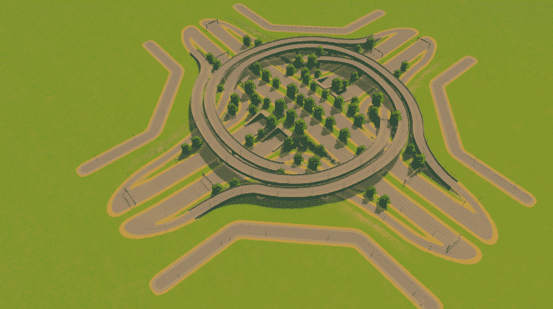 The Innercity Turbine connects 2 Highways with a very nice look. I`ve placed at the Edge of the Turbine some 2 Lane roads, which can be used to buils a geometric city. The special at the Turbine is that the right turn lane remains near the Highway, which gives you some extra space for your city.