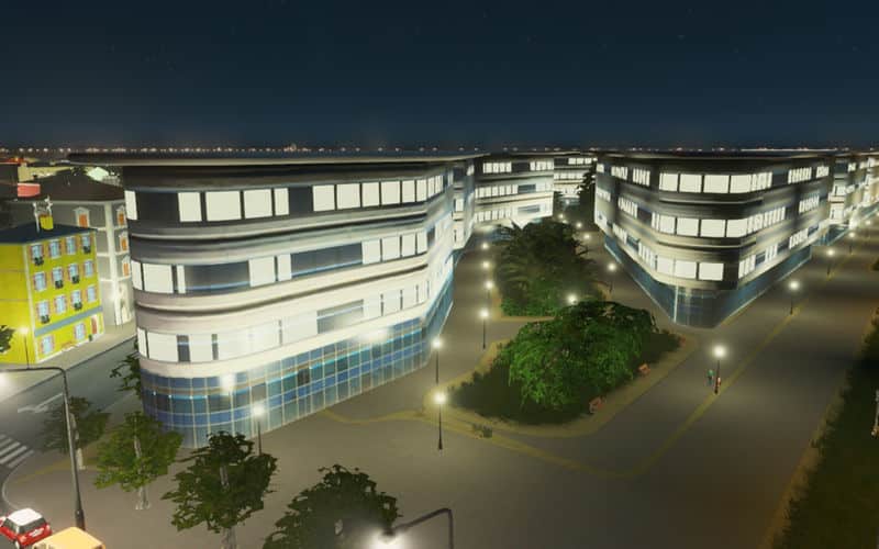 – Published screenshots are an example of how to put the template inside an existing city. The downloaded template includes only the main building and the scene objects related to it. Parkings, side buildings and roads are created with normal game controls