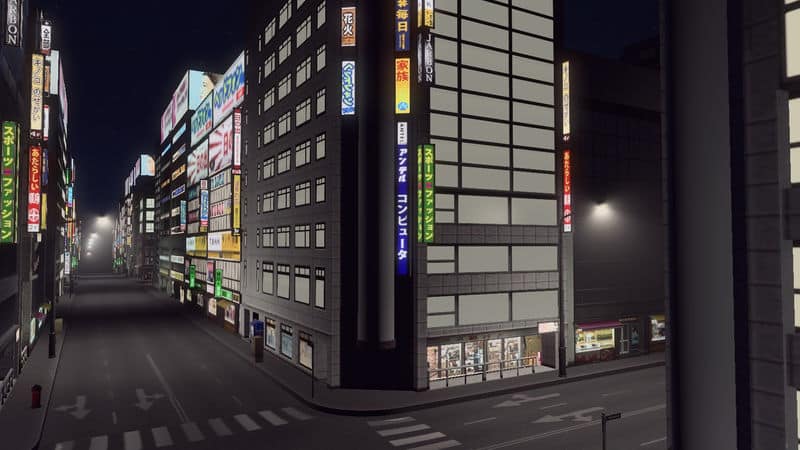 A commercial building model from the Cities in Motion: Tokyo DLC. It features an updated illumination, and specular map and a reworked diffuse map. The model is edited to fit a 2 tile wide lot for a tightly packed, wall-to-wall commercial area.