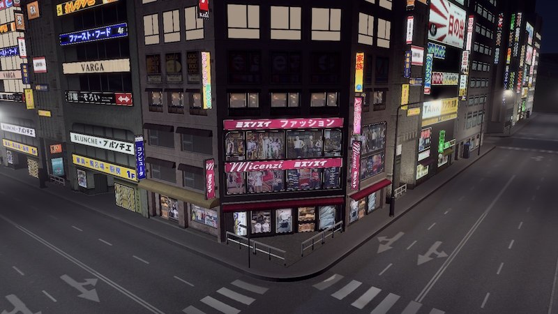 A commercial building model from the Cities in Motion: Tokyo DLC. It features an updated illumination, and specular map and a reworked diffuse map. The model is edited to fit a 2 tile wide lot for a tightly packed, wall-to-wall commercial area.