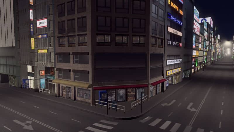 A commercial building model from the Cities in Motion: Tokyo DLC. It features an updated illumination, and specular map and a reworked diffuse map. The model is edited to fit a 2 tile wide lot for a tightly packed, wall-to-wall commercial area.