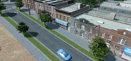 A commercial building model from the Cities in Motion: Tokyo DLC. It features an updated illumination, and specular map and a reworked diffuse map. The model is edited to fit a 2 tile wide lot for a tightly packed, wall-to-wall commercial area.