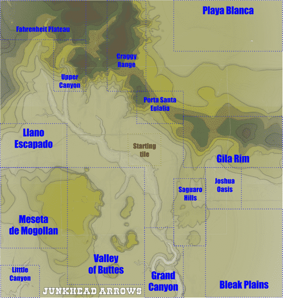 The largest building areas are around the starting tile in the middle, in the areas “Llano Escapado” and “Meseta de Mogolan” in the west and “Bleak Plains” in the southeast.