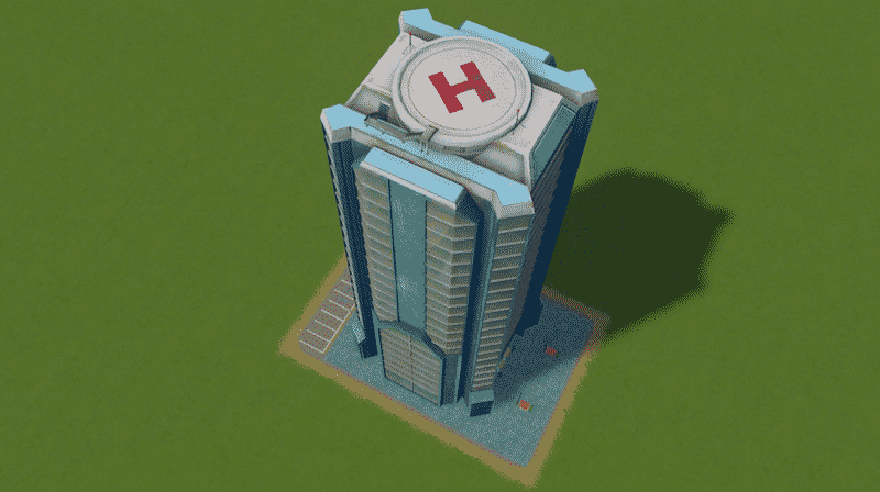 Added some cosmetic bonuses including a helipad marker. The model is a Vanilla Highrise 4×4 L5. It is the first one on the list of L5 4×4 Highrises should you wish to disable it via the theme manager mod. In my city many doctor offices however are in buildings such as these. I am also sure many big cities have downtown hospitals that look more like your average office building than the standard vanilla one. You might even wish to keep the vanilla one active and have a random building mixed into the city which spawns helicopters like this one which is pretty cool if you have the Disasters DLC.