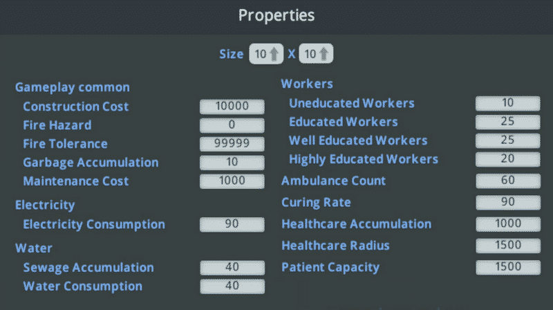 Cheat Hospital V1. Stats buffed across the board and ready for immediate use. Asset intended for those like myself who don’t use RICO but want a wider window in focussing on building your city while in PLAY mode.