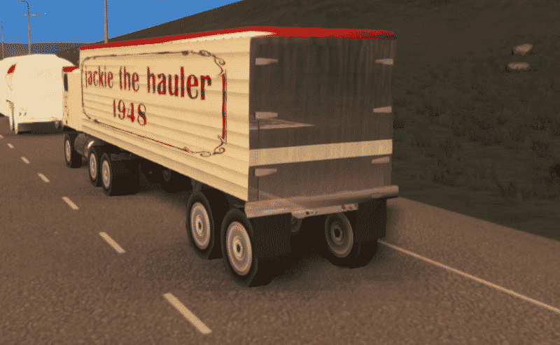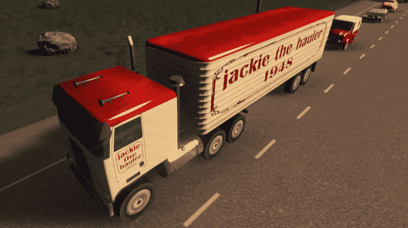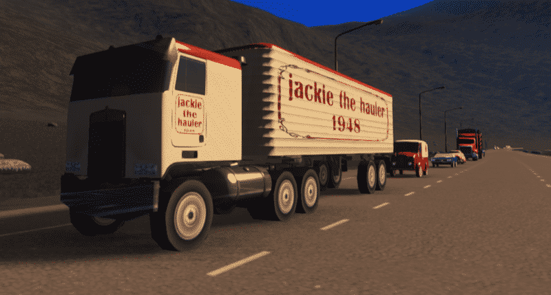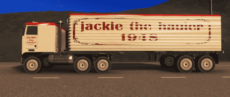 This is the kenworth k100 from 1986, the pride of jackie’s fleet of transport vehicles. It uses a stretched fruehauf trailer to haul all kinds of goods all over the City. This variant Comes with a sunvisor for improved comfort for the Trucker driving it.
