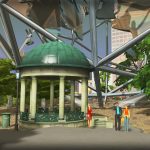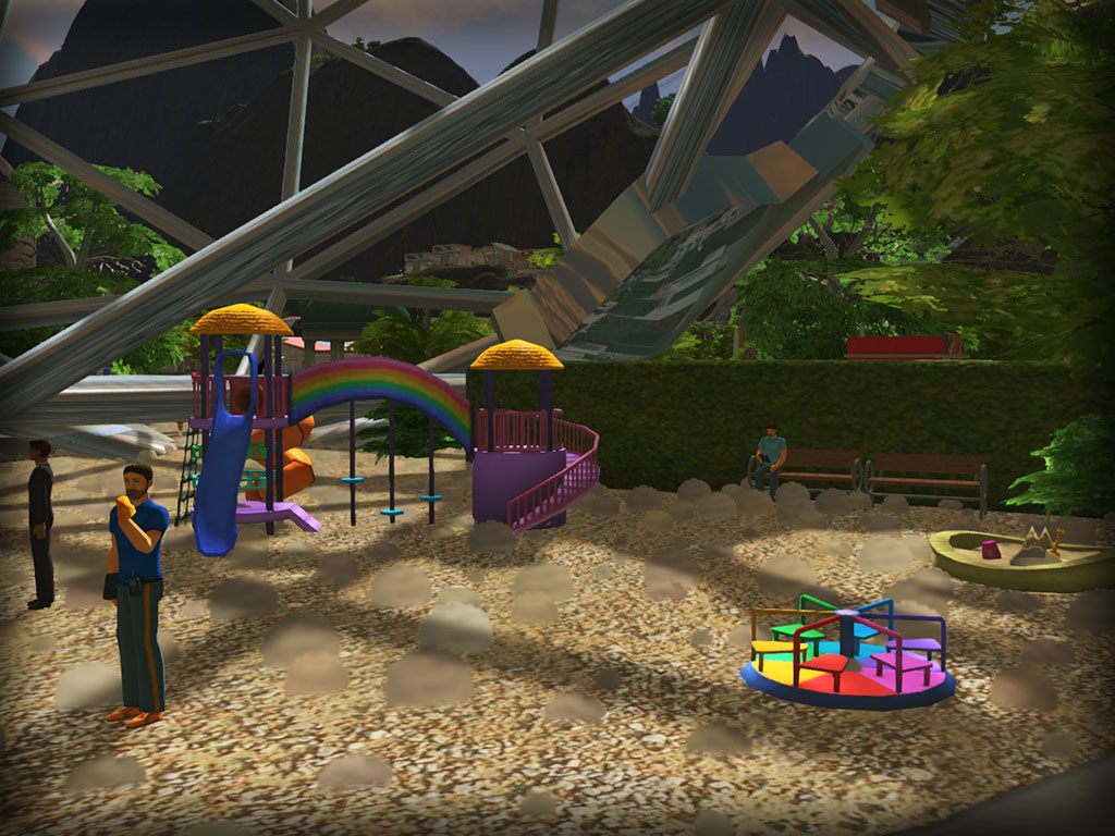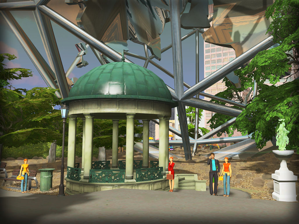Unique statue in a park, well decorated with a pavilion, fountain, dining area, playground, benches and trees.