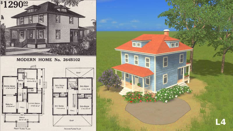 This is a collection of Kliekie’s five Sears Homes she kindly converted to levels 4 and 5 and allowed me to landscape. There is one of each of her homes for levels 4 and 5, so that as your city’s low density residential increases in level, you will see more and more of these homes. Mixing these in with other American style homes will give you even more variety and give it an authentically American look.