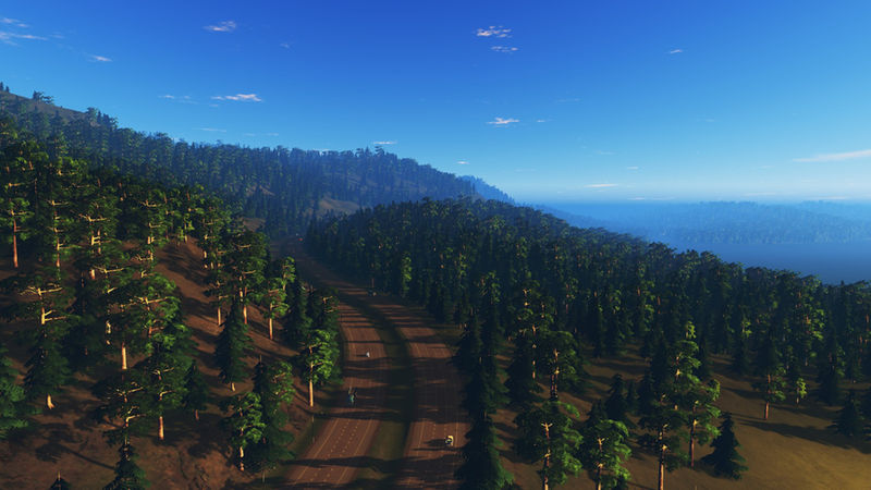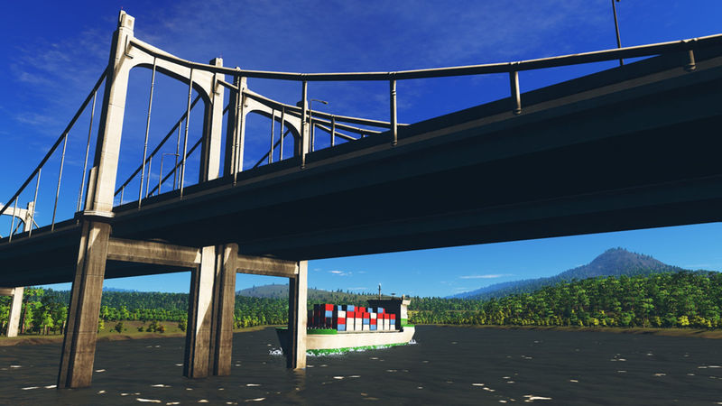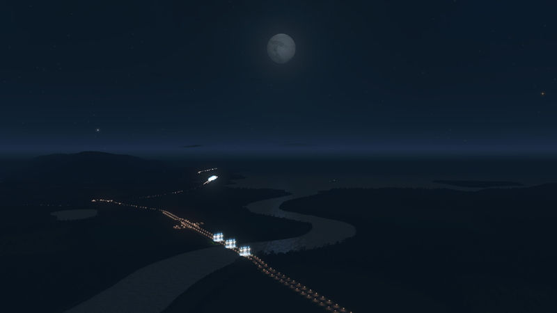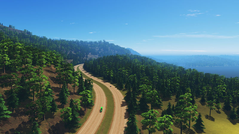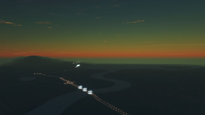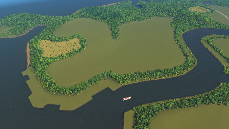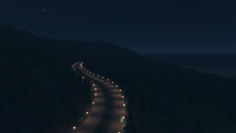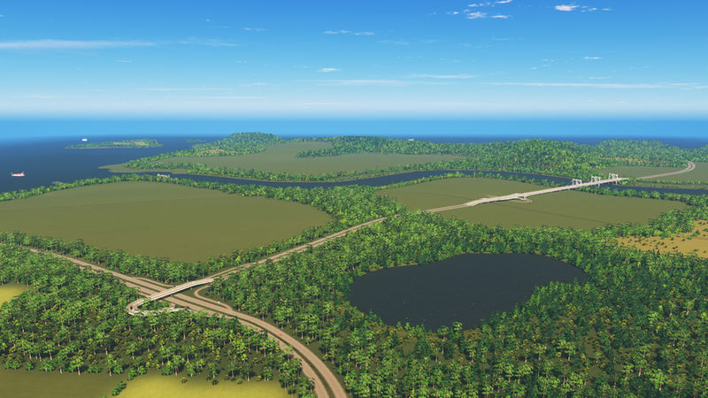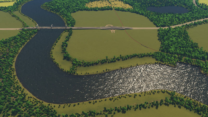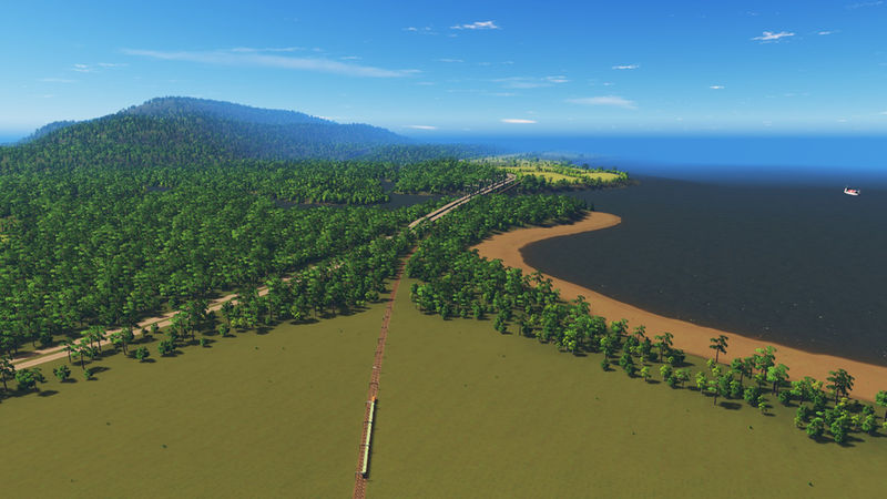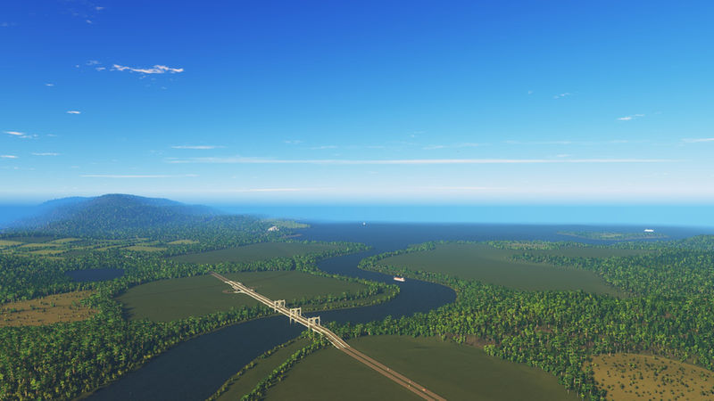 I’ve placed three highway routes, that join in the centre of the map. One of these curls along the mountain side. There is one rail line that crosses the river and the starting tile. In the third image of the slideshow is an area that has been optimized to place a tunnel, for either a highway or an avenue. There is enough space to build an airport. There are ship routes around the coast, the big river and between the small island.