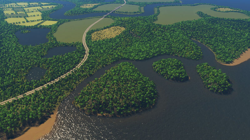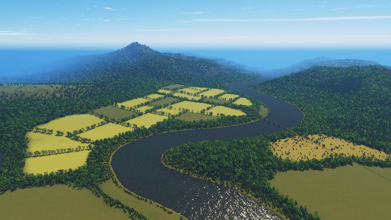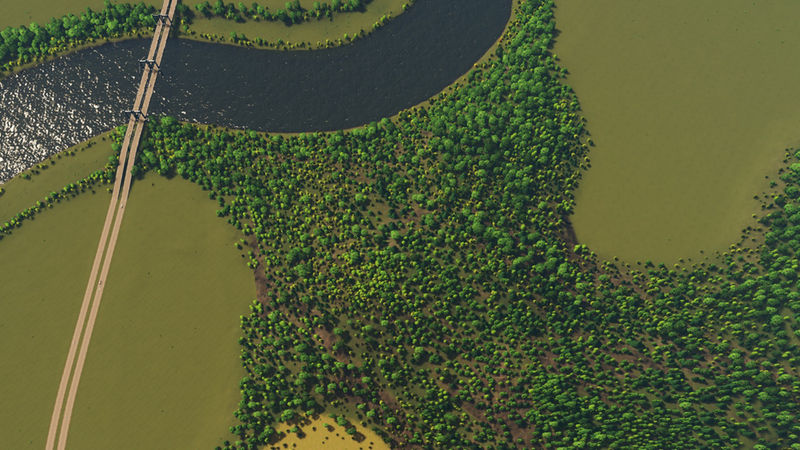 This map has a bit more height compared to my usual maps. It has lumpy hills, the occasional cliff, and two small islands in one corner of the map. However, there is plenty of flat space along the river to build your city. On one side at the mouth of the river is an area that has been optimized for ports. I’ve tested these and they should be great for building a transport hub. The second image in the slideshow shows the starting tile.