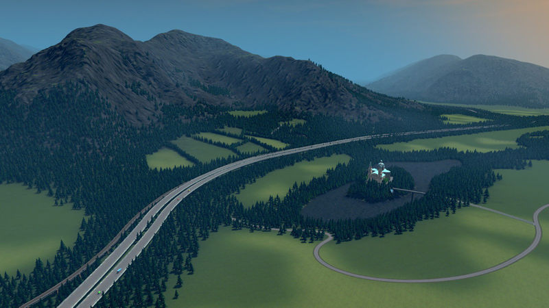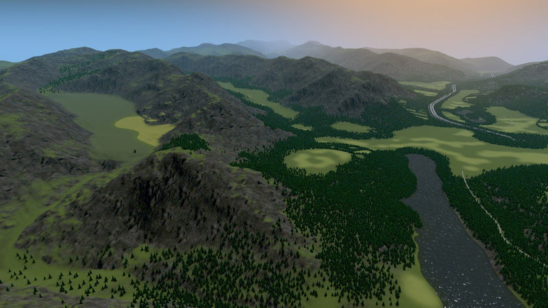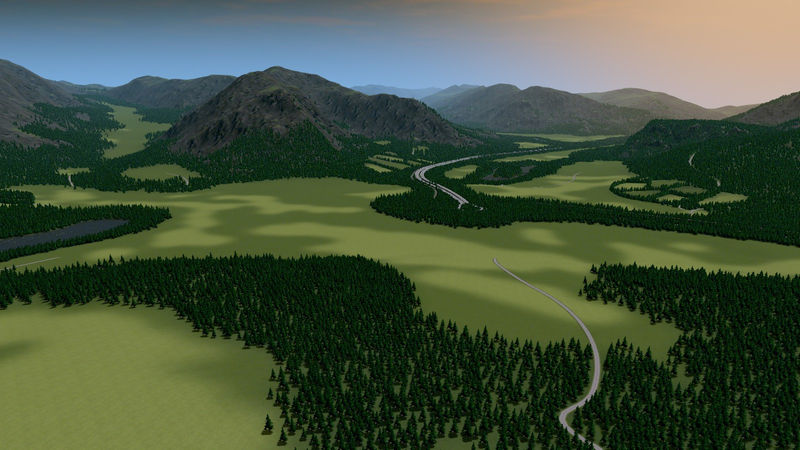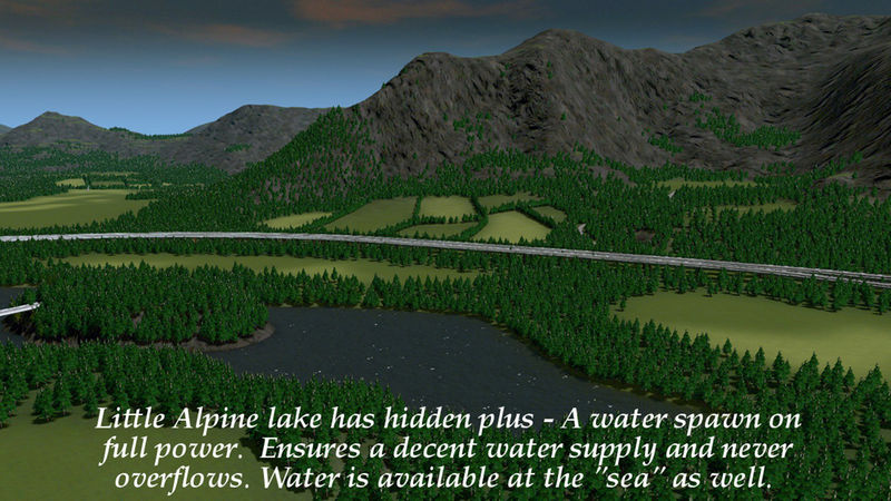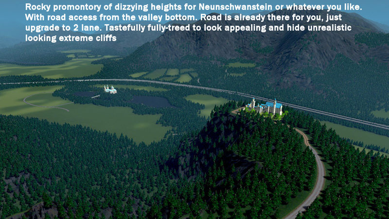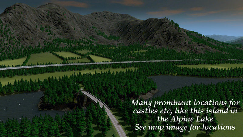 – Many valleys separated by steep mountain ridges, as well as little hills to place Alpine villages. Almost like several maps in one! Many different views and scenes to experience and build, from extremely high (top of peaks) to valley lakeshore.