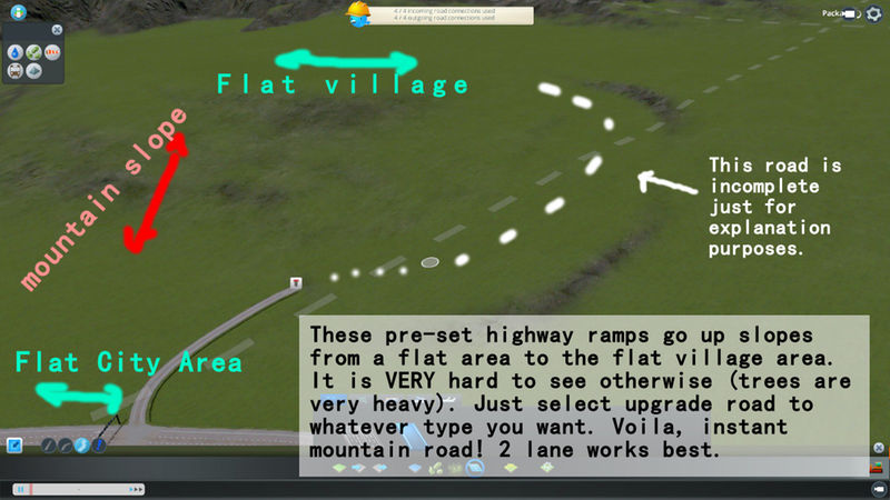 – Roads up hills to villages are already laid down using Highway Ramps. Just upgrade the road to your choice (usually 2 lane is best). I learned this idea from Kold (see note at bottom). The terrain and how to get up the hills is MUCH harder in this map, which is why I included these pre-set guideroads. Delete if you want, of course.