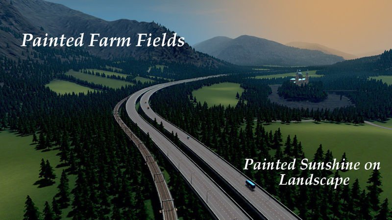 – Handpainted terrain “sunshine” as in my other maps, as well as painted and treed farm plots placed on areas that are sloped, so they won’t get in the way of your city.