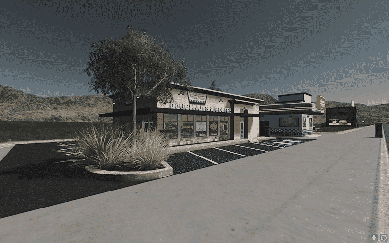 This is a 2×3 level 2, low density commercial growable asset. This is a good place for sims to head out for a donut on the go! Includes an occasional bad driver who will park their car across to parking spaces right in front!