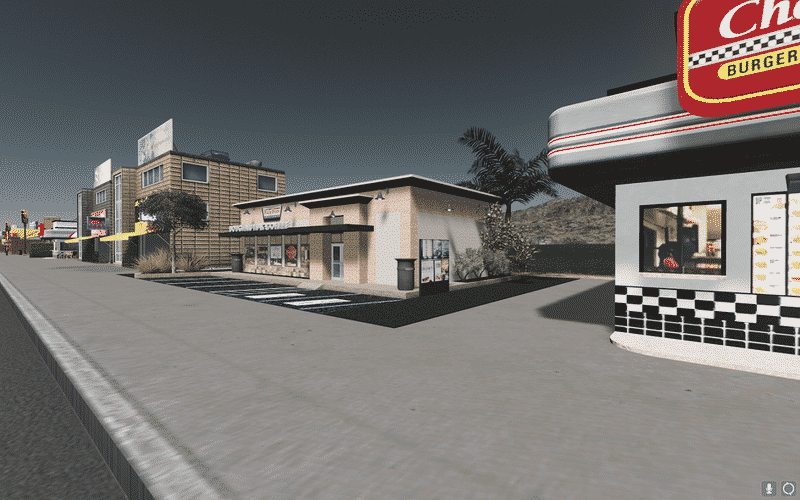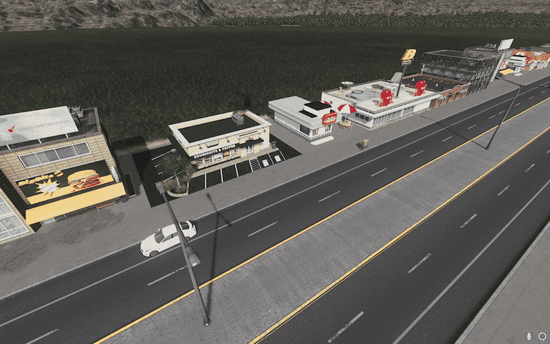 This is a 2×3 level 2, low density commercial growable asset. This is a good place for sims to head out for a donut on the go! Includes an occasional bad driver who will park their car across to parking spaces right in front!