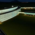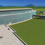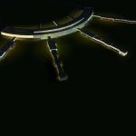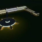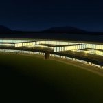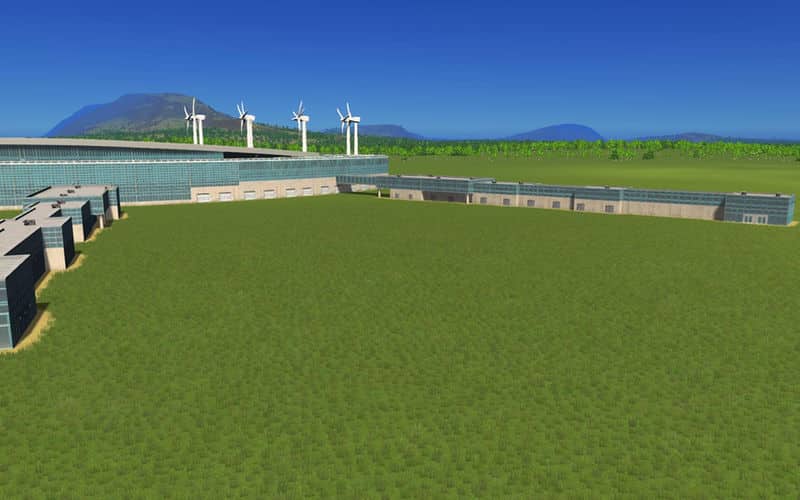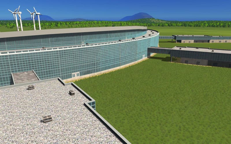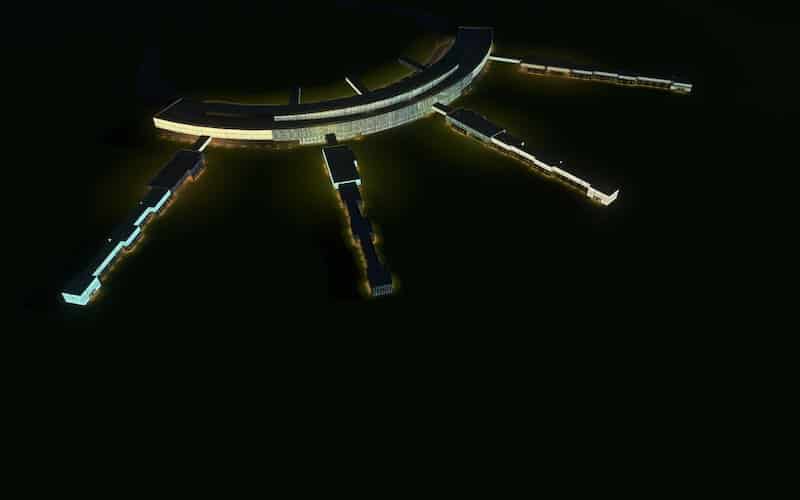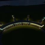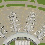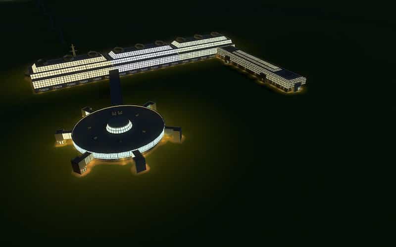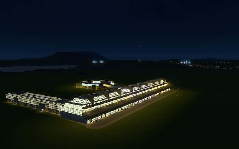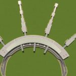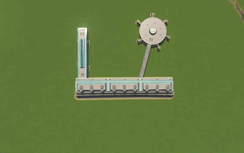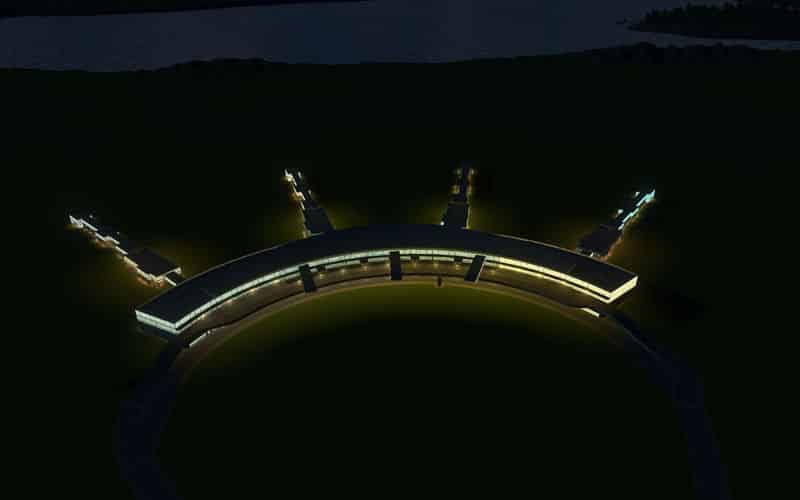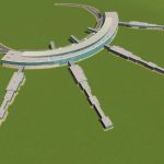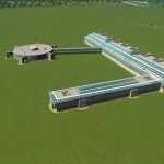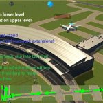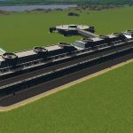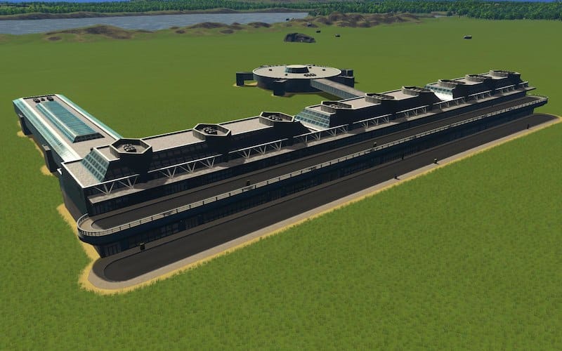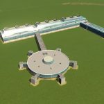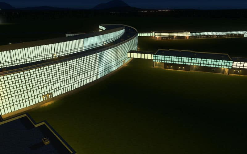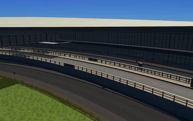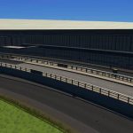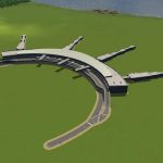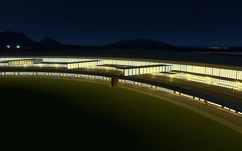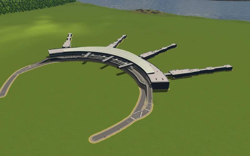 The terminal design is setup for a split-level road, where the upper level is for departures, and the lower level is for arrivals. The exposed surfaces that would normally be covered up with roads are textured at a lower resolution, since they are not intended to be seen. For best results, I suggest using several mods: Fine Road Tool, Road Anarchy, MoveIt, No-Pillars Mod, and More Network Stuff (I think this is the one that lets you remove lights). Street lights should be disabled with the roads used for “accessing” the building, since the model already contains lights (and street lights will clip through it).