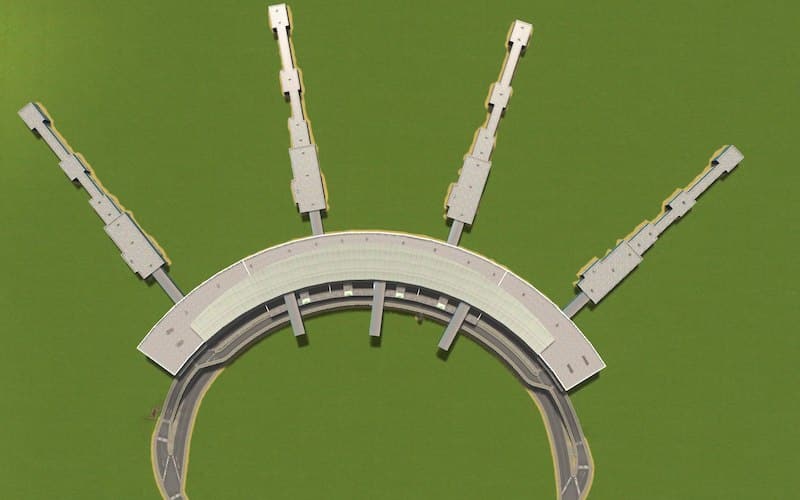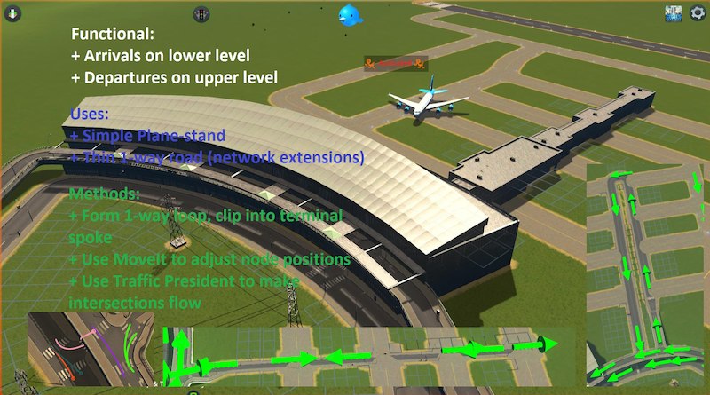 An image has been uploaded showing screenshots on how to do this. You will still see vehicles / pedestrians under the CTerminal_Bridge part, however, it’s barely noticable. Addtionally, for proof that this method does work, a plane can be seen using one of the plane stands in the screenshot. And since the screenshot is in game, you can also see that there are no “missing road connection” icons (i.e. the loop road clipped ontop of itself does not cause issues there).