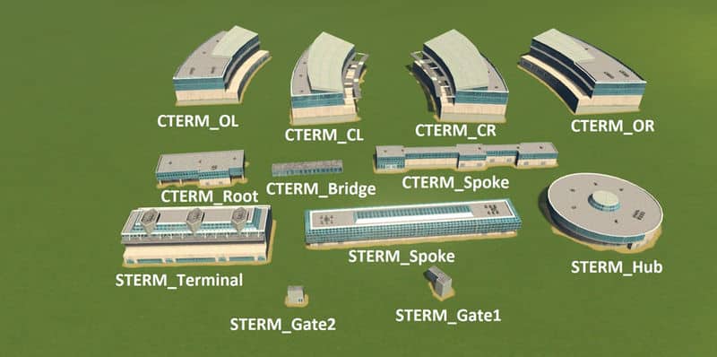 The airport that these assets are based off of (Laguardia [LGA], outside of New York City), the CTerminal (terminal B at LGA) assets would not use the Gate1 and Gate2 assets. However, the STerminal (terminal C at LGA) uses the Gate2 assets. The circular hubs were based off of a nearby airport (Newark Liberty), uses the Gate1 assets.