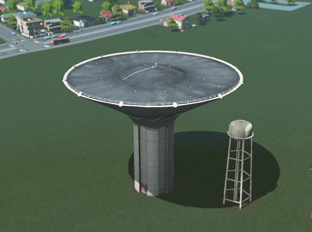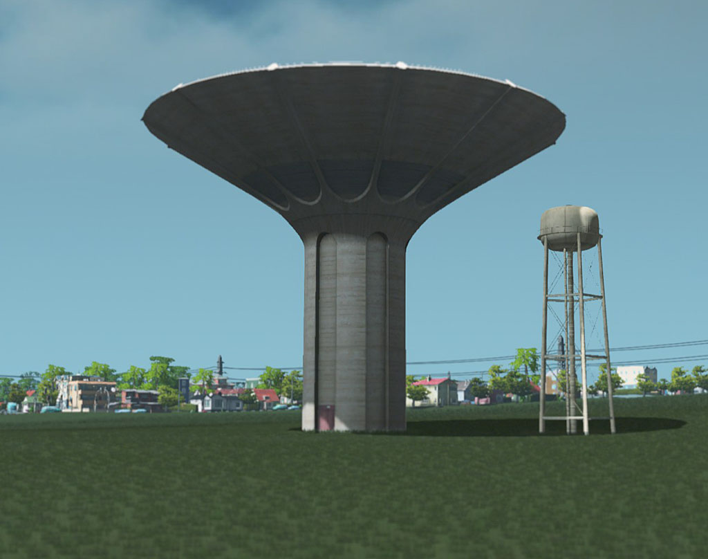 Very large watertower with 5x water capacity compared to default. Based on watertower in Roihuvuori, Helsinki, Finland. The original was built in 1978 and holds 12600 cubic meters of water.