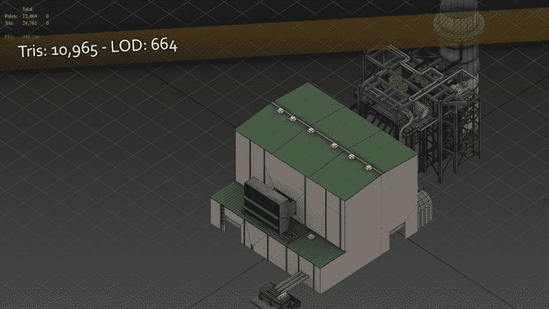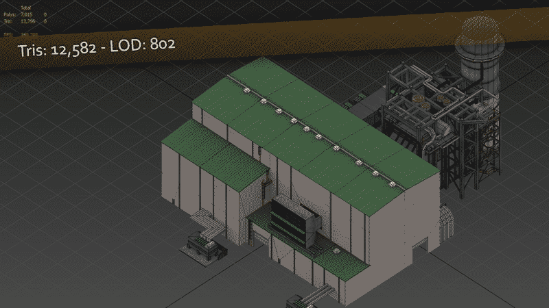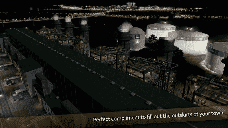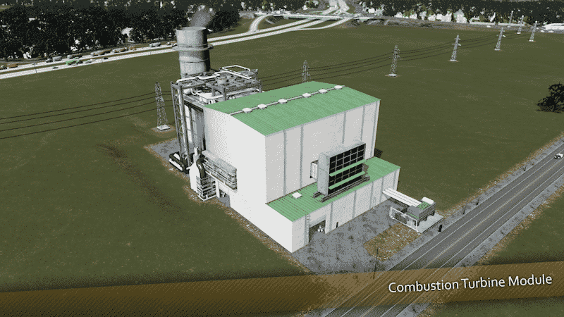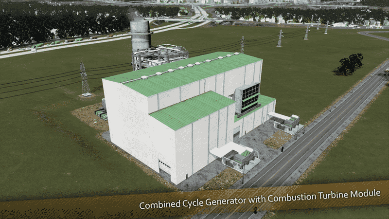 This asset contains two buildings: a combined-cycle generator fed by waste heat from its combustion turbine. The second is just a combustion turbine alone in its housing. Both assets can be combined in any order to create a modular power station that looks the way you want.