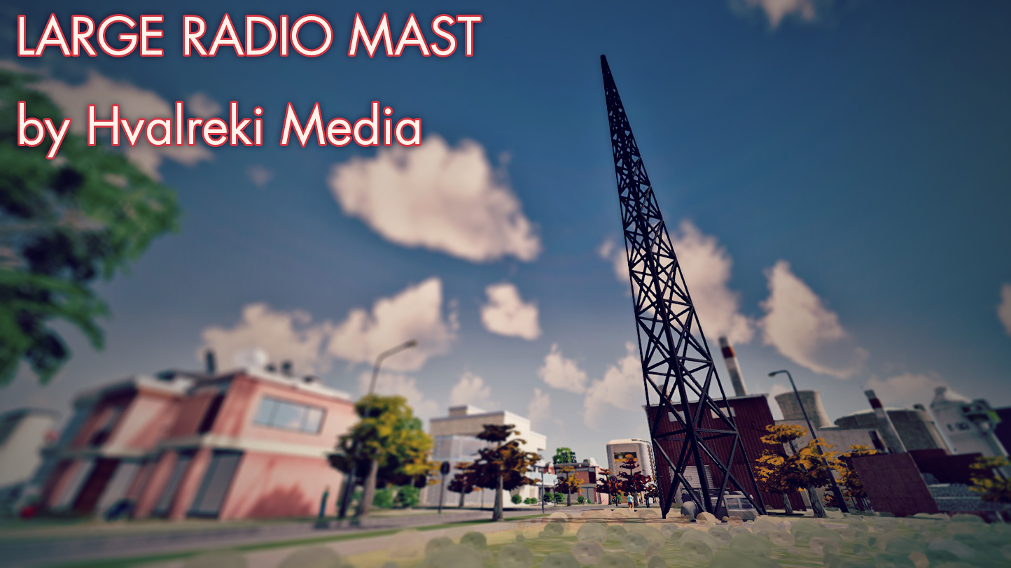 Thanks to popular demand, I have created a standalone radio mast for decorative purposes in your city. The radio mast is 20 meters tall, which is about half as tall as most high density skyscrapers in the game. This asset has the added bonus of relaying power a small radius, which is why it can be found in the “power plant” category. Please note that this asset is not supposed to produce power, so do not be alarmed when the GUI tells you that it is producing 0mW.