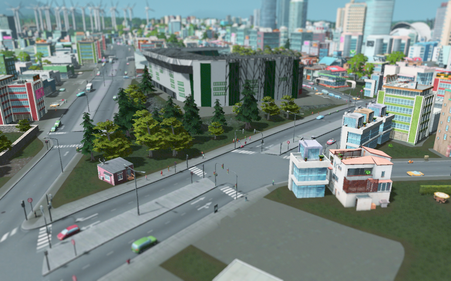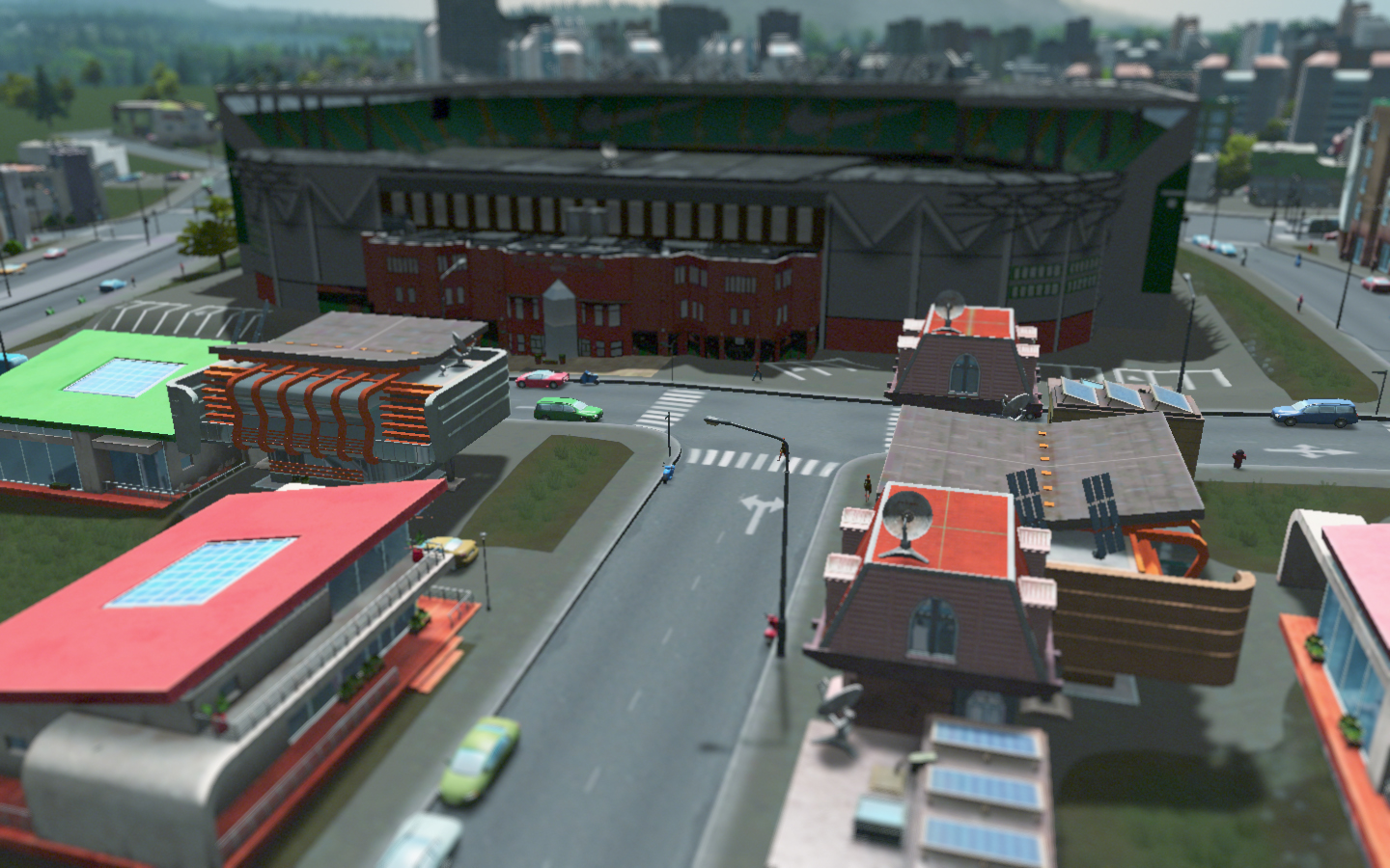 I chose the biggest size possible (without loosing proportion) and tweaked a little at the height of it. I am not a big fan of the modular system. The idea is good, but I (!) like more single buildings and a original size arenas base would be 20-30 tiles and by that more than 5 times bigger than the bases of the biggest zone-skyscrapers. I like them more when they blend in, hoping that they update the possible sizes to 18×16 tiles… than I update the first assets.