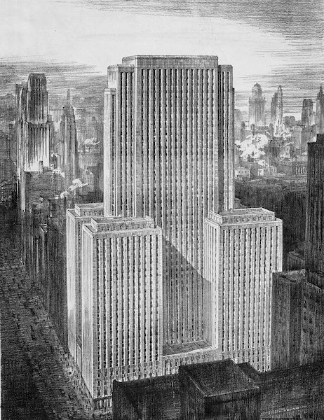 Chicago art deco towers are often shaped like “chairs”, as opposed to the “wedding cake” style of New York art deco. As such, this limestone hulk consists of a black marble base that gives way to four turrets at the corners enclosing the central tower. The two turrets at the rear are conjoined to form the “back” of the chair. Brass windowframes are recessed, cut into stiff ribbons to emphasize the building’s verticality.