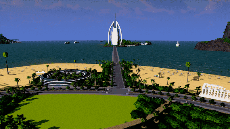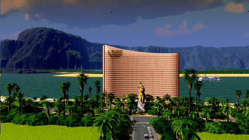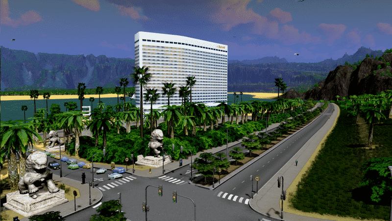 Hotels, stone statue, palm trees, tile, landmark buildings and many others.