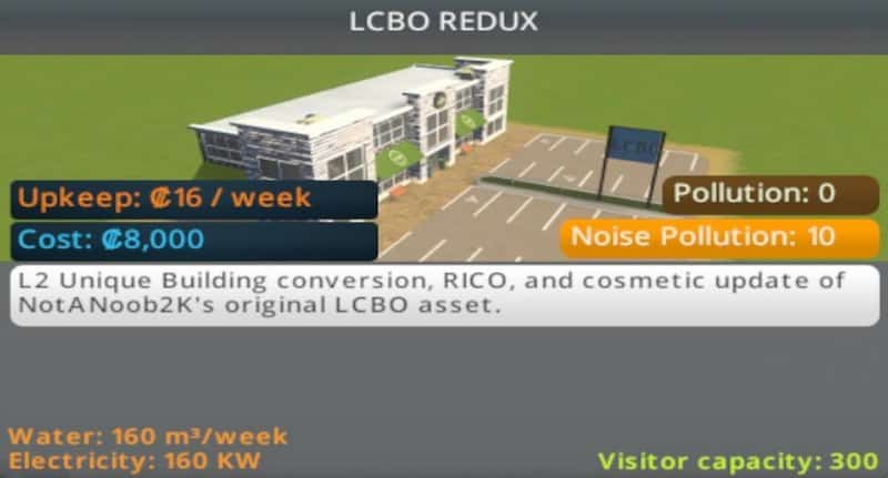 This LCBO is a cosmetic touch up with RICO stats added to the wonderful original by NotANoob2K. I am fan of his work; especially because I am Canadian. You will notice the asset is not AD. This isn’t because LCBO is provincially owned or not open 24hrs in real life. It doesn’t have AD because I am still learning. Right now practicing using a few mods for editing buildings in the asset editor.