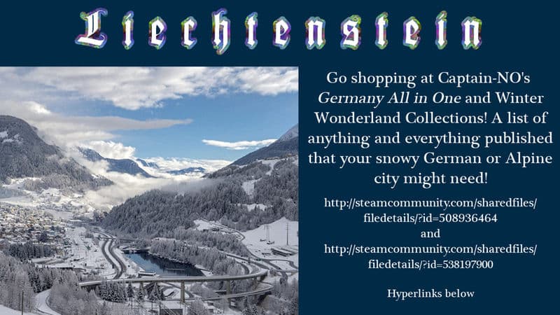 2 – To deck your Liechtenstein map out with the best Central European buildings and items, visit Captain NO’s Germany collection. There you can shop among countless listings which will fit the looks of this tiny Alpine principality. His Winter Wonderland collection will complement your Liechtenstein city as well!