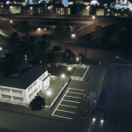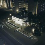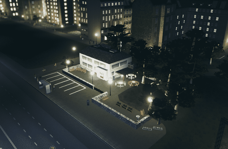 No custom props or mods are required. The building is lit up at night, but the After Dark DLC is not required.