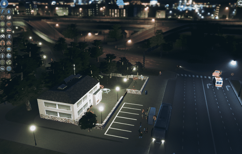 No custom props or mods are required. The building is lit up at night, but the After Dark DLC is not required.