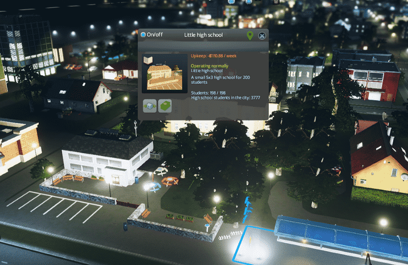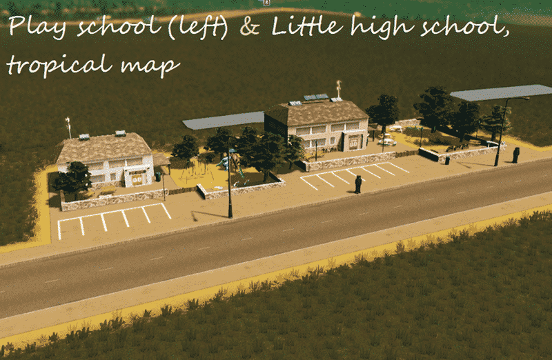 The Little high school is much smaller than the standard high school, its student capacity and many other stats are 1/5 of the standard high school. It is useful for a remote small neighbourhood or a small island, or just to add variety to your schools. It is unlocked at the same time as the standard high school.