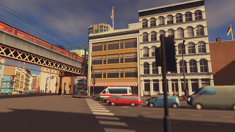 A fancy commerical building with dignifying white terra cotta and modern wide windows. The building was inspired by a sample picture from old catalogue of New Jersey Terra Cotta Company.