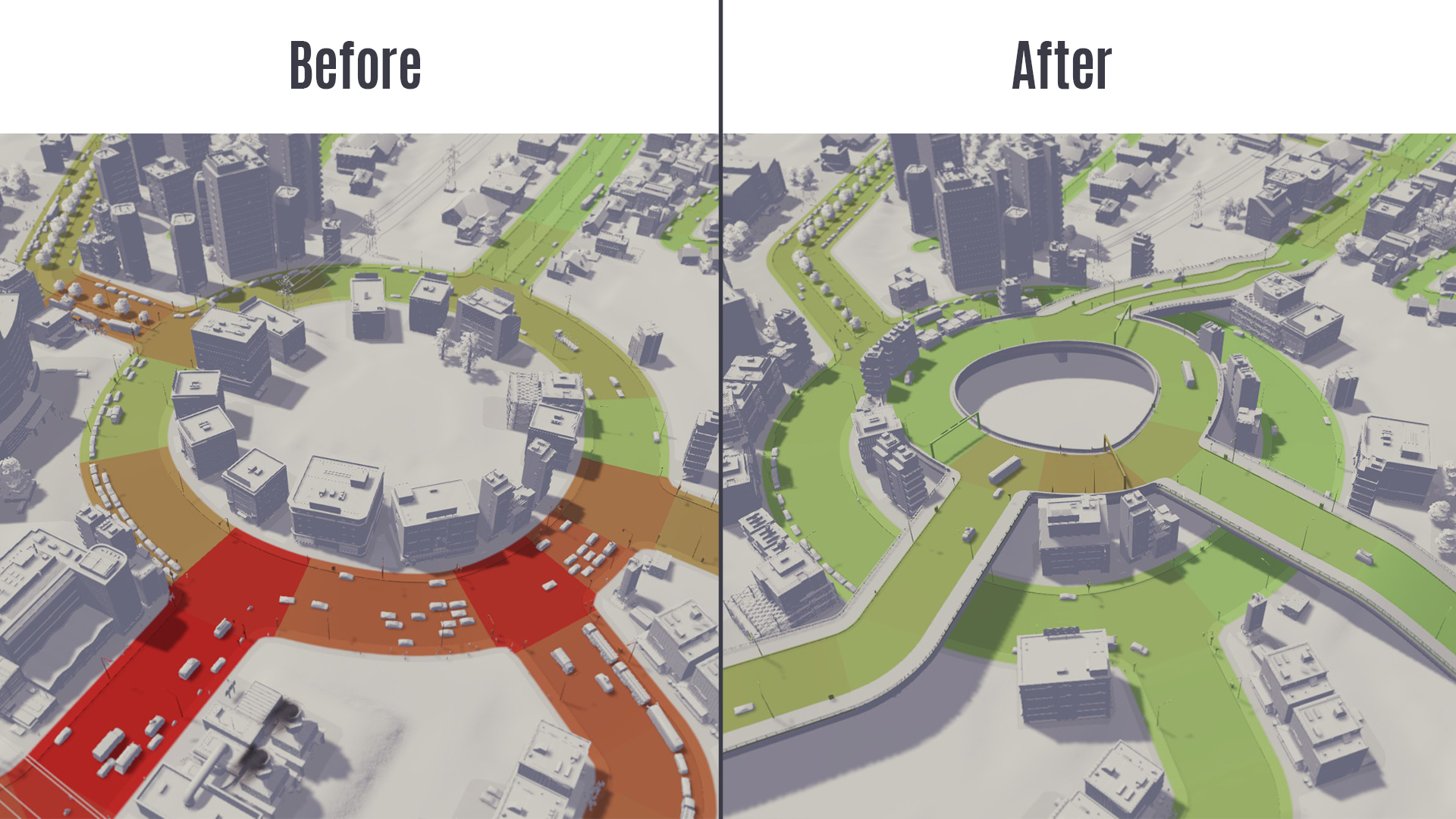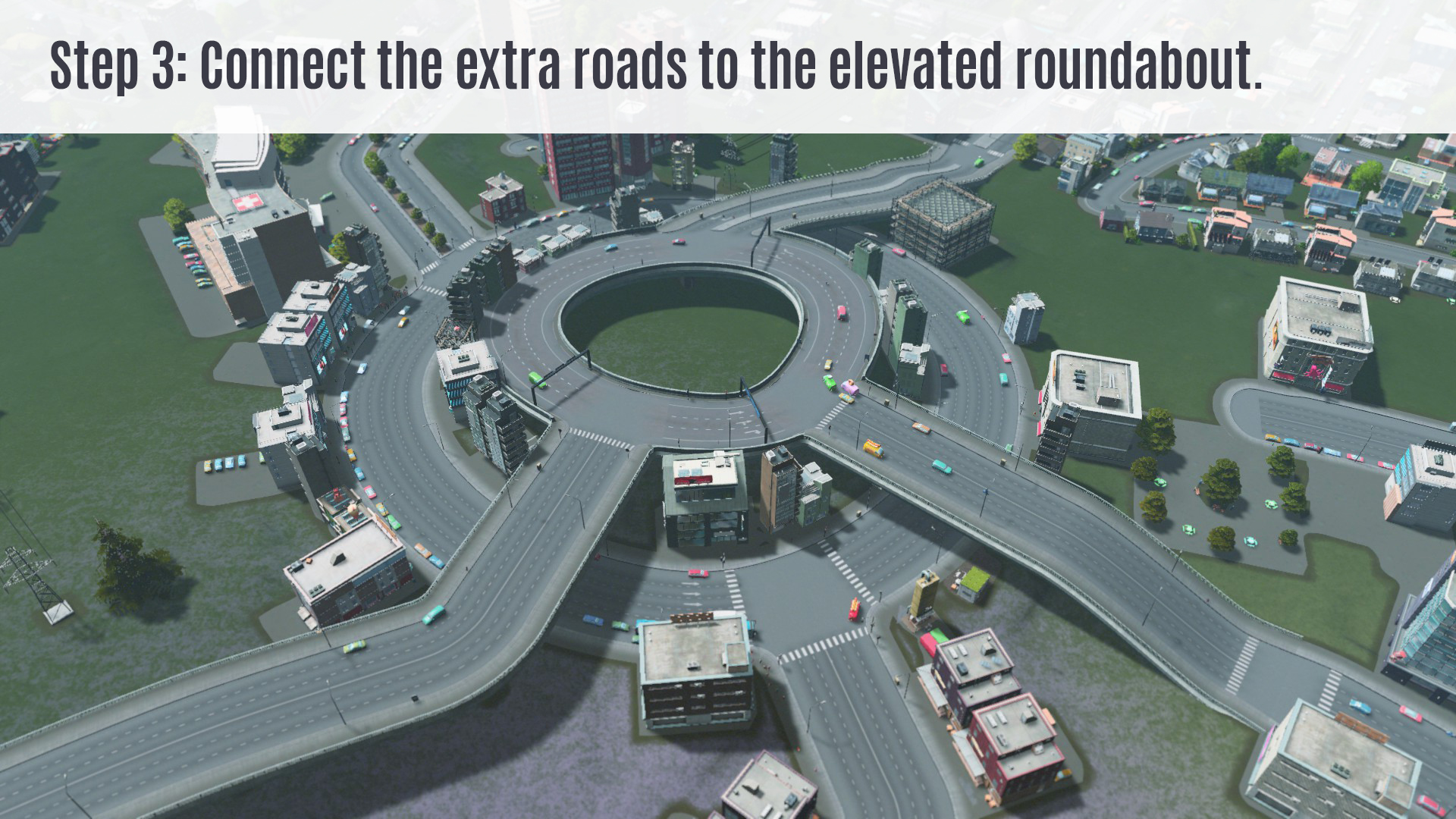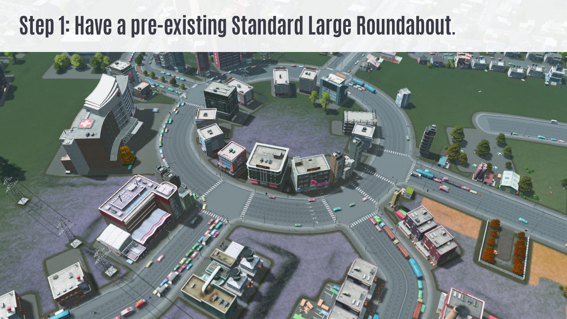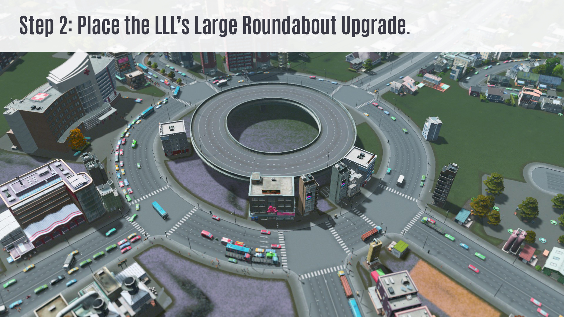This is the Large Roundabout Upgrade I made for you! Just place this over an already built vanilla Large Roundabout. And connect your extra streets to this elevated roundabout to clear traffic problems. See pictures for demonstration.
