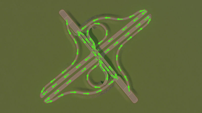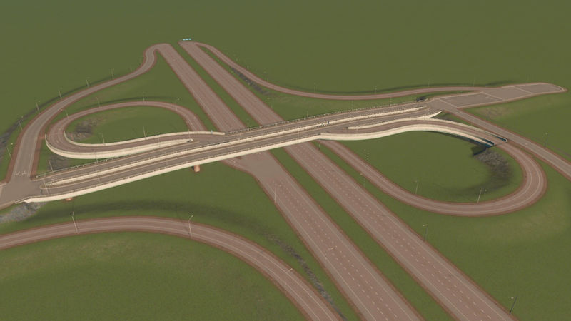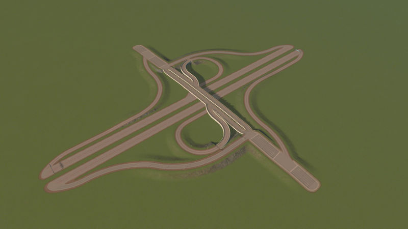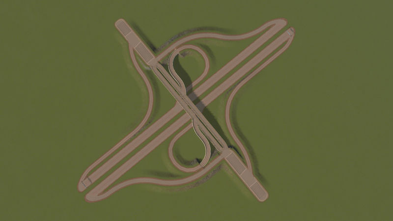 This is my version of the parclo A4 interchange (A.K.A. Six-ramp partial cloverleaf). This particular version allows you to connect a large road with a motorway. Doesn’t contain any traffic lights by default but this can be changed by upgrading the 4 lane roads to something else.
