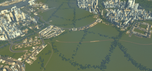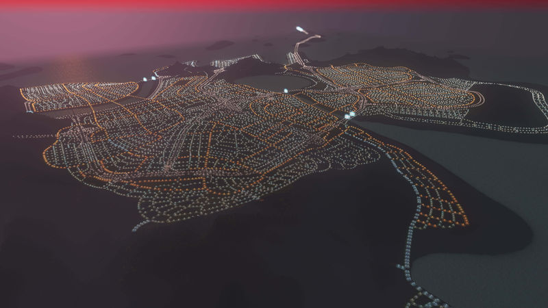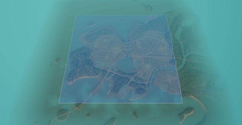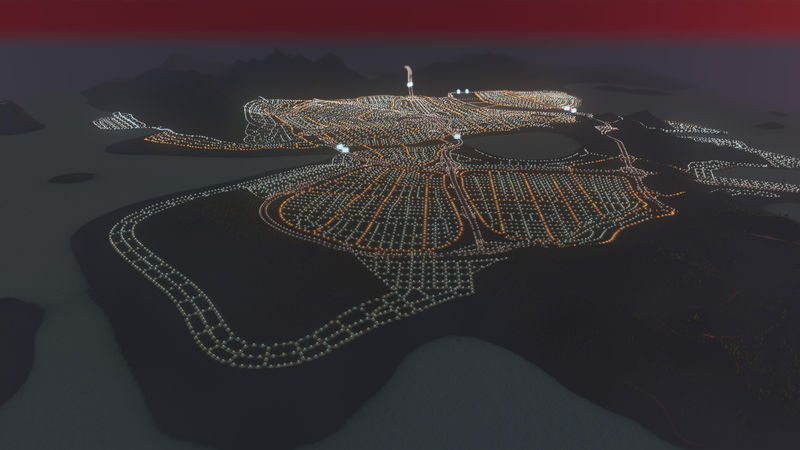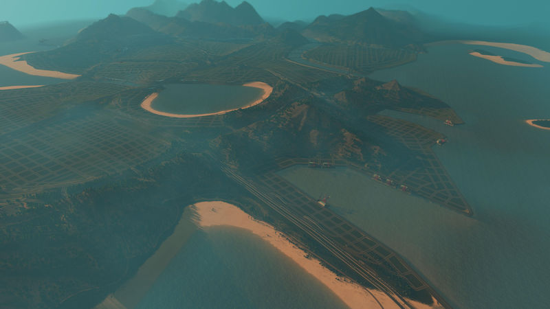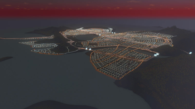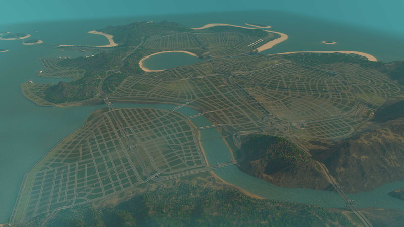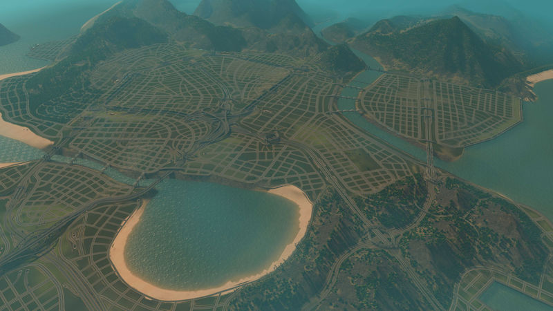 This map has a Los Angeles style to it with a harbor and industrial district as well as a mountain range along the coast. There is also a sunken interstate system with many interchanges including a modified 5 way interchange by fluxtrance.