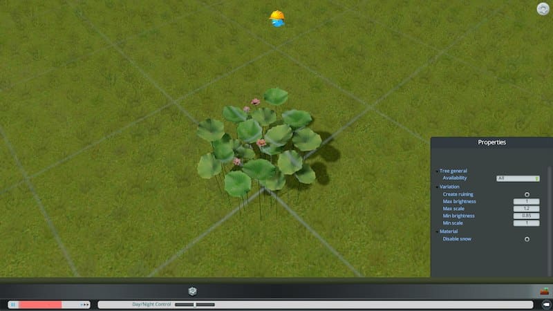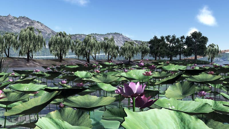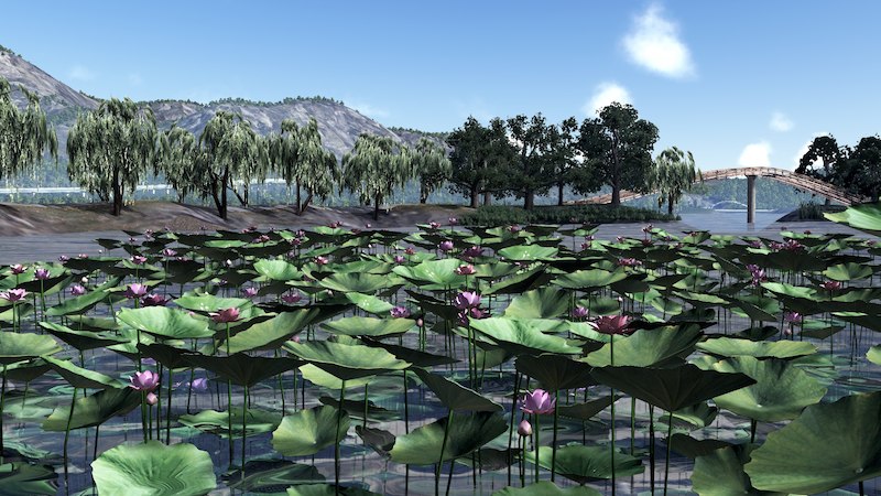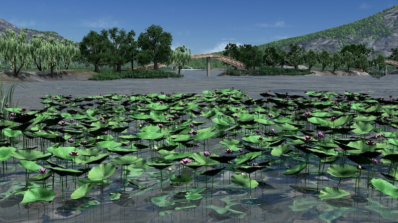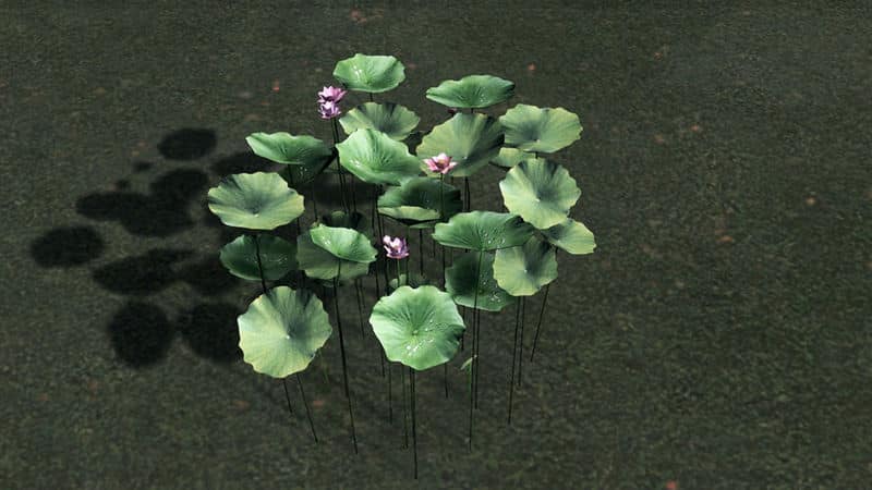 一小叢荷花和荷葉.請使用BloodyPenguin的Prop & Tree Anarchy允許它種植於水中,以及Extra Landscaping Tools來調整水底深度.(您或許已發現它也可種植於陸上,但我不知道如何限制).建議使用Boformer的Random Tree Rotation .