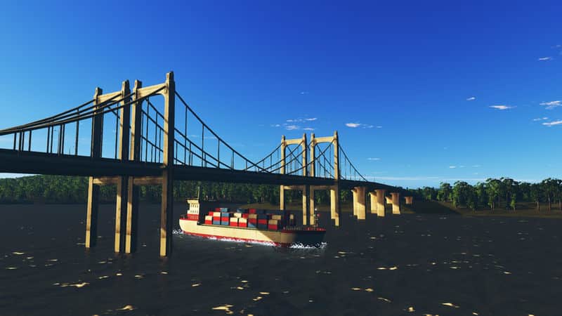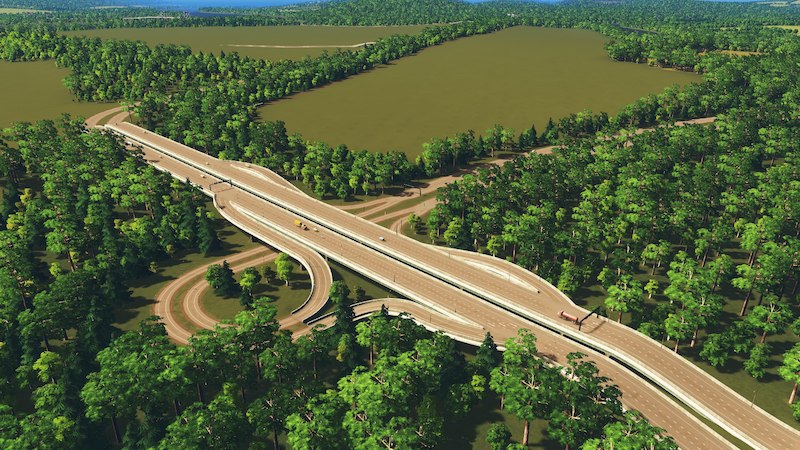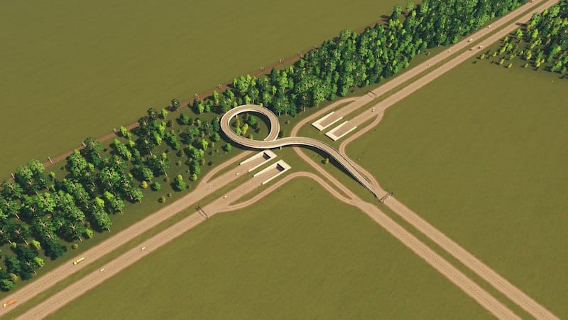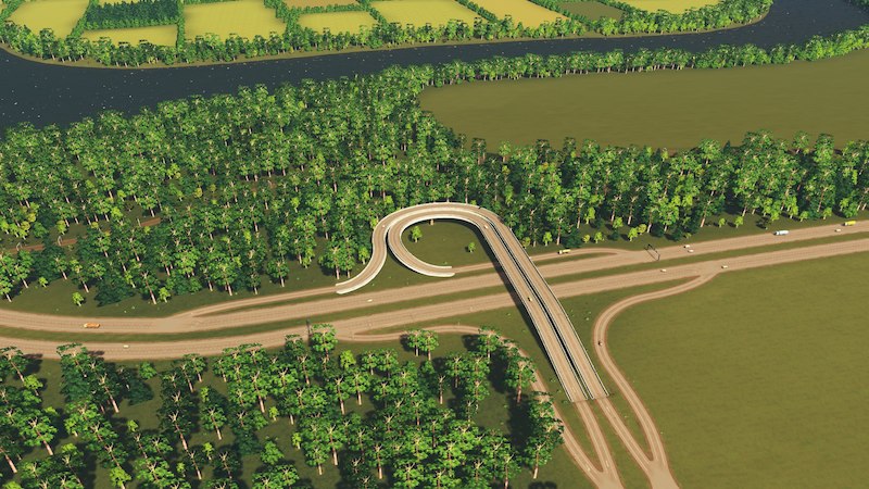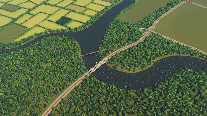 There are four highways and four railways. The big river has a ship route, but the smaller rivers don’t. The intersections can be found in my Smooth Highway Collection, the one next to the starting area is a new addition.