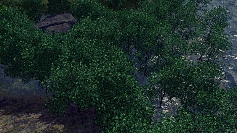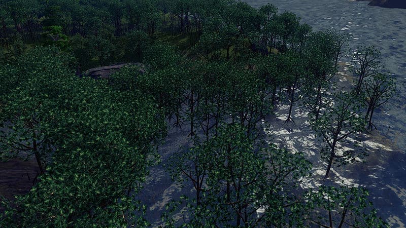 A Known Issue: Trees do not yet have official support for being placed in or near water. Trees will begin to thin out on wet surfaces. So the more these trees are on wet land, the thinner they will look in some cases. This is clearly seen when we are at LOD distance. I’m not sure exactly how it works but sometimes trees are placed in or near water with no problem. Expect an update in the future for better LOD support in wet areas.
