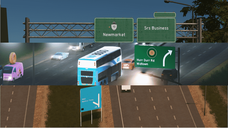 To add a sign, click on the “Mark Route” button->”Add a sign”, and type in the route type and destination(type in “n” without the quotes to split lines up). After clicking set, rotate the sign with the mouse using prop tool controls, and click on the location you want the sign to be at.