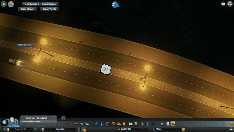 To add a dynamic sign, click on the “Mark Route” button->”Add a dynamic sign”, and first select a road segment that you want to measure traffic at. Then, rotate the sign with the mouse using prop tool controls, and click on the location you want the sign to be at.